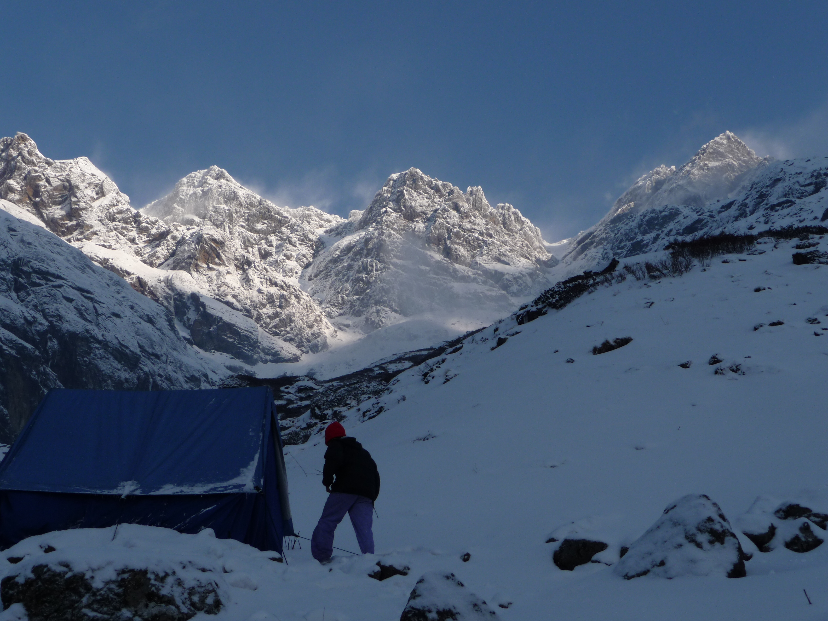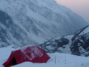 Waking up at Rupina La Base Camp (4000 m., 13,123 ft.) was a uniquely Nepal experience. The sounds of our wonderful hosts and kitchen staff offering us tea and washing water in the darkness of 4am on the side of a Himalayan mountain. The snow tapered off during the night and the sky was clear of any sign of bad weather just as dawn broke. We were excited to be underway and were anxious to make it over the pass and put the toughest part of our trek behind us.
