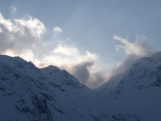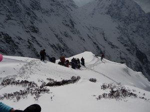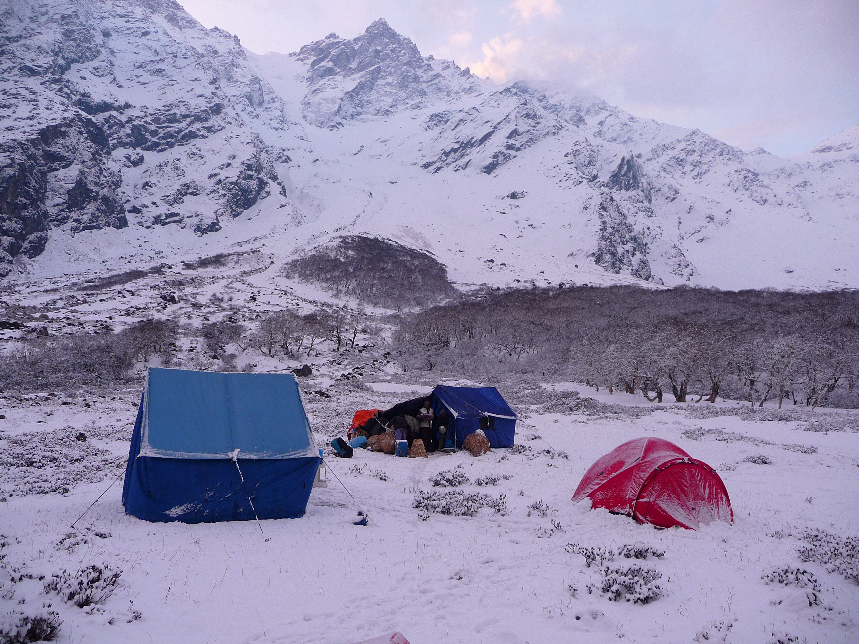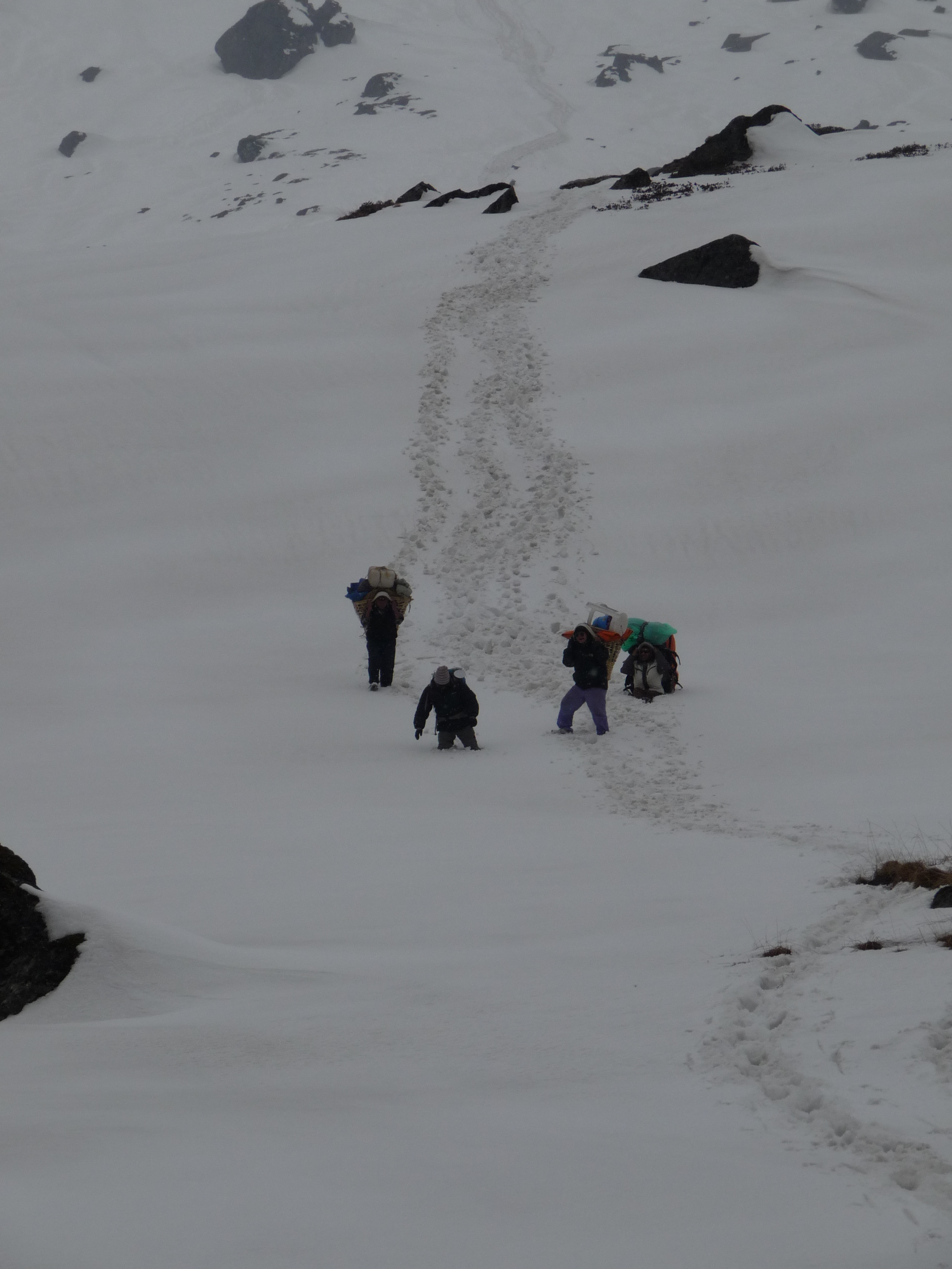 We fully expected the climb to be difficult at such a high altitude, but as it turned out, the descent was much tougher. The snow on the slope in front of us was deeper, warmer and much, much steeper than what we had just ascended. With the skies turning gray and the snow and wind picking up, choosing an appropriate path was more important than ever. The slopes at first were so steep they could only be descended with long traverses, and as we dropped lower, the problem instead became the depth and softness of the snow. It was slow going, especially for our porters with their heavy loads. Once we had descended far enough to be out of danger, it became absolutely comical as one porter after another would attempt to cross the deepest snow and sink to their waist.