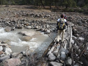With the pass behind us, the next day found us continuing downward toward the Baudha Himal Glacier, which would join our path from a valley coming from our left. The weather warmed every hour as we descended and it was easy to feel that we had just walked out of winter and into spring. We crossed beautiful meadows that were just showing signs of grass and flowers and across snow melt rivers on the most rustic bridges imaginable. Other than the building we saw at the bottom of the pass, we saw no signs of human activity other than the bridges. After the difficulty of the pass, it was an easy morning.