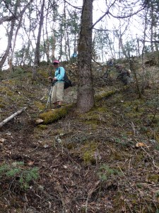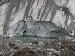 Rather than a valley filled side-to-side with ice, the glacier was instead a long, high ridge going down the valley center, and we were well below the sides…far below the sides. It was, in effect, a valley-within-a-valley. Reaching the glacier meant first climbing a 100 m., very steep hill dense with pine. At the crest, the glacier began immediately and was a bizarre landscape after hours of walking in fields and forests.