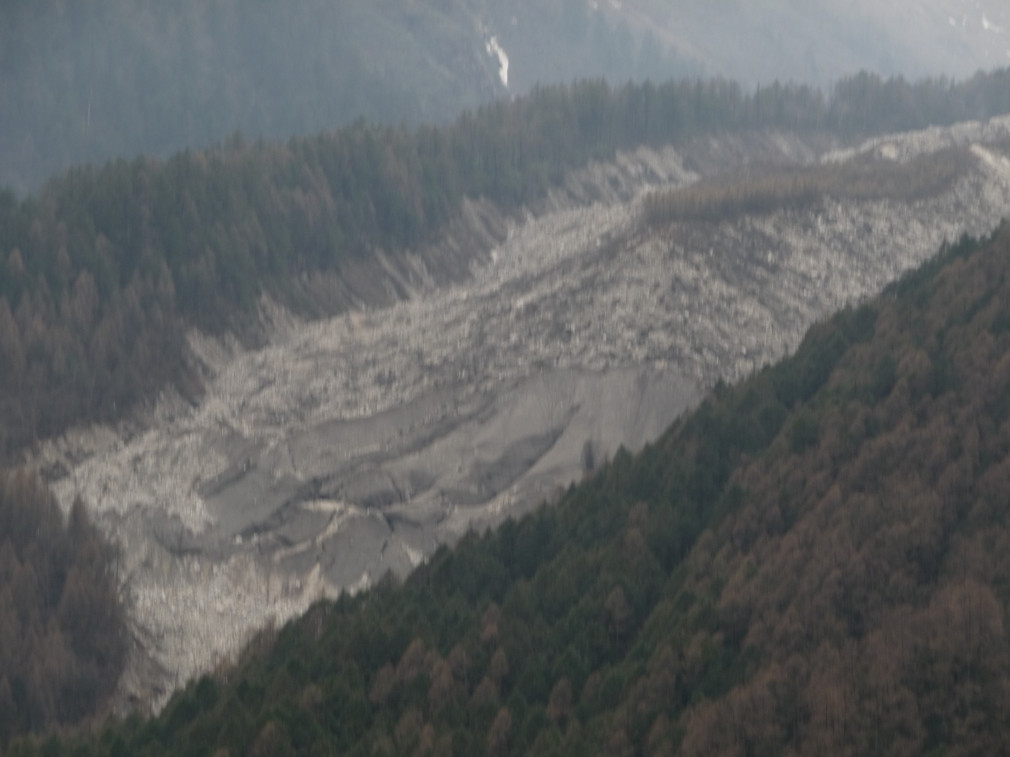 was surreal to see the terrain and all of its variation. The pools of water that were perfectly still on the surface of the glacier were turquoise blue, and here and there amongst the piles of rocks, could be seen patches of ice. It was impossible to know how deep the glacier was, but we assumed it was at least as high as the ridge we needed to climb to reach it, so 100m. or more. It was a great relief to again climb a hill on the far side of the glacier and to descend through another very steep pine forest before reaching the valley floor once again. Unless we were standing on the glacier itself, there was no evidence that this enormous river of ice was just behind us.