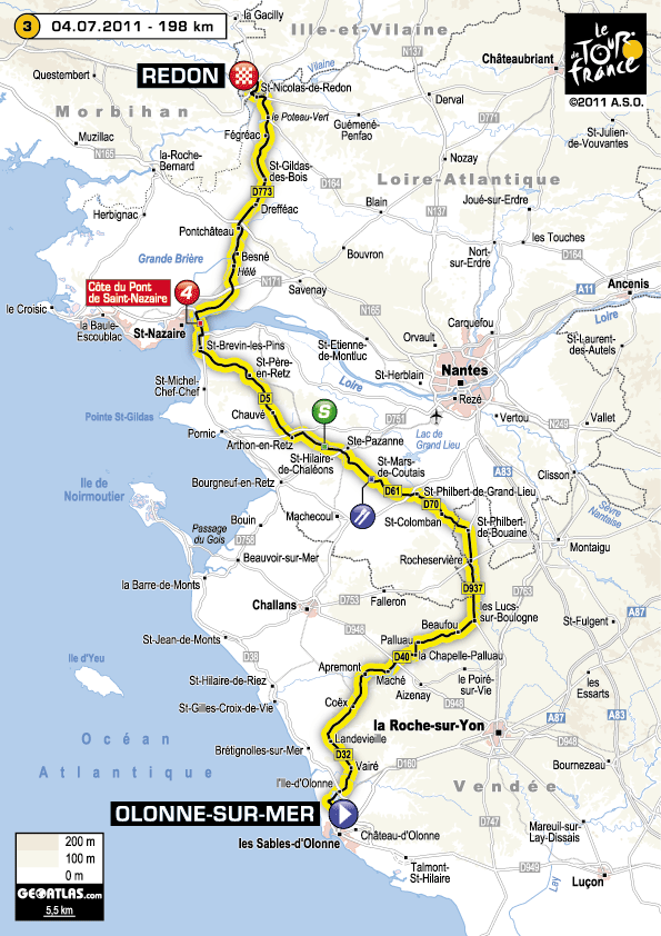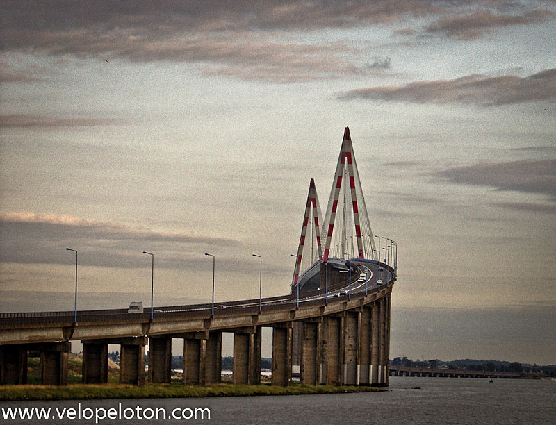 The cyclists will pass over the Pont de Saint-Nazaire, a 68 m. (223 ft.) high bridge that spans the enormous Loire Estuary at the mouth of the famous river. Each day’s highest point is a race to the top where the first there wins “King of the Mountain” for that stage and receives one point in the overall standings. The highest point is nearly always a mountain or at least a hill, but this part of Western France is relatively flat and the bridge takes the honor for Stage 3. This is France, after all, and rules are rules.