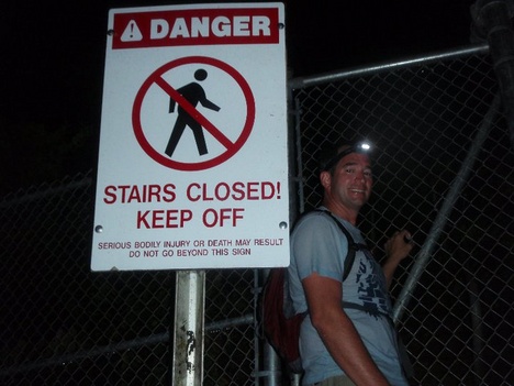 The plan was to park in the residential neighborhood near the entrance, quickly depart our cars before arousing the suspicion of the neighbors (who frown on anyone sneaking in) and to find our way up a drainage ditch. Everything went according to plan and we were on the first sections of metal staircase within 15 minutes of parking. Other than very slippery mud, the challenge was to find our way quietly in the dark as we passed through backyards and gaps in fences. Anyone wanting to claim ignorance of the prohibition on climbing would have to ignore the many signs warning of the staircase’s closure to the public.