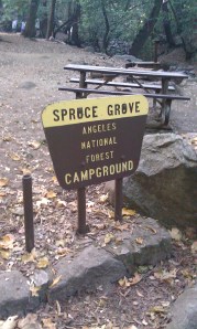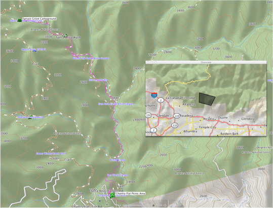 Before reaching our destination, the trail left the Canyon floor and began to switchback up the west side of the Canyon until we were in an open area on the side of the hill and were able to look back on the foothills leading west toward Los Angeles. The trail soon led back into the thick cover of the Canyon as we approached the campground. Once we reached the Spruce Grove we took one of the available picnic tables and gave snacks to Mitch and Gwenn and took a break. We were delighted to see the route carefully stored in the GPS. The return trip was uneventful as we carefully avoided poison oak once again. We made the final hill a speed challenge and arrived at the car feeling we’d had great exercise and yet another great trail experience in Southern California.