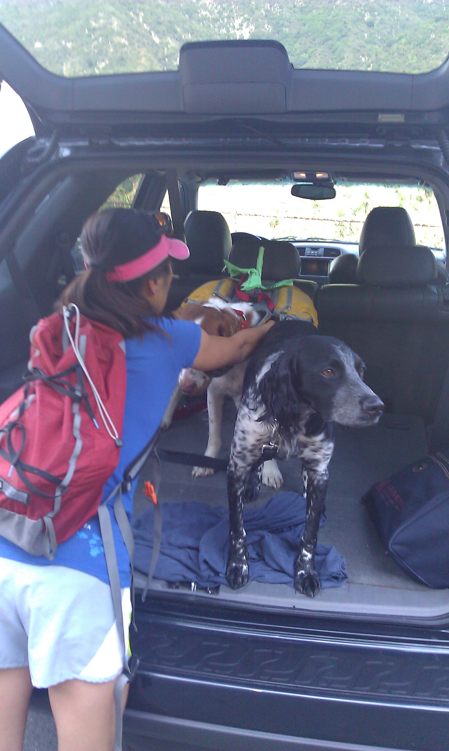 The crowds thinned considerably once we left the main trail to the very popular Sturtevant Falls and instead took a left toward Spruce Grove Camp, a campground 5.8 km (3.6 miles) from Chantry Flat. The turn comes in the middle of an area with several cabins grouped and you must watch for the sign on the left. There are two choices, and we recommend the trail to the top of the falls (it is marked as such). The trail at first followed the left (west) side of the North Fork Santa Anita Canyon (the canyon split just before the trail junction) until it reached the top of Sturtevant Falls, then followed the Canyon floor most of the rest of the way. There was a great overlook above the Falls where we could see the crowd below and several great pools above the falls for the dogs to jump in and cool off. We had to be very careful to keep them out of the poison oak that was plentiful along both sides of the trail, and the pools gave us some small reassurance that they were cleaning off.