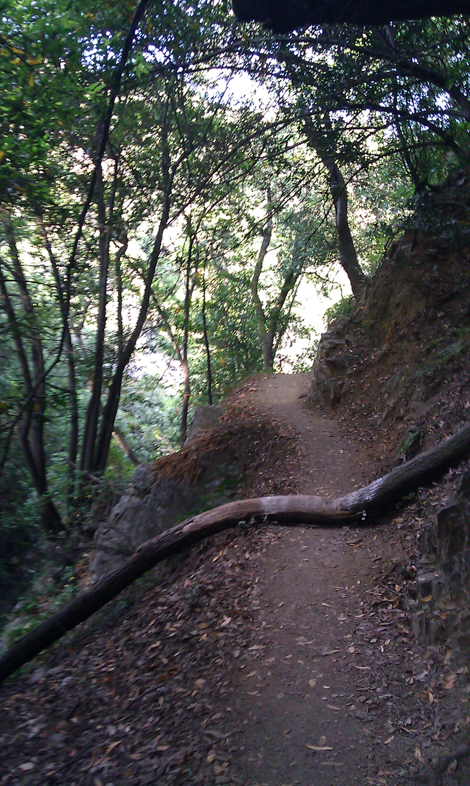 With Gwenn and Mitch well aware we were going to hike, we drove the short distance from REI in Arcadia, CA to the Chantry Flat trailhead just a few miles north on Santa Anita Avenue. The trail head itself starts just at the beginning of the parking lot, on the right side, and immediately starts with a significant descent from 630 m (2068 ft) down into the Santa Anita Canyon where it reaches the low point for the hike at 514 m (1689 ft) after the first 1.3 km (.8 miles). Starting a hike by going down 120 m (400 ft) is tough mentally because it means having to climb a reasonably steep hill to finish the day. Once down the hill the trail flattened out and became shady and pleasant, though there were plenty of people in this first section, something we prefer to avoid.