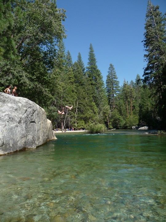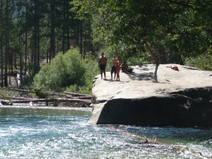 The biggest single attraction for people camping in Kings Canyon (or staying at the Cedar Grove Lodge) is Muir Rock and “The Beach”. These two sites are adjacent to each other and are a very short trail (100 m) from the parking lot at Road’s End, which is, simply put, the end of the road that passes through the canyon. Generations of people have been jumping from the rock into the Kings River, and generations have urged the more timid to make the leap into the fast, cold current. Just below the rock, the water is crystal clear and deep enough for diving or the more typical feet-first leap. The Beach, just up river, is the perfect vantage point to watch the action.