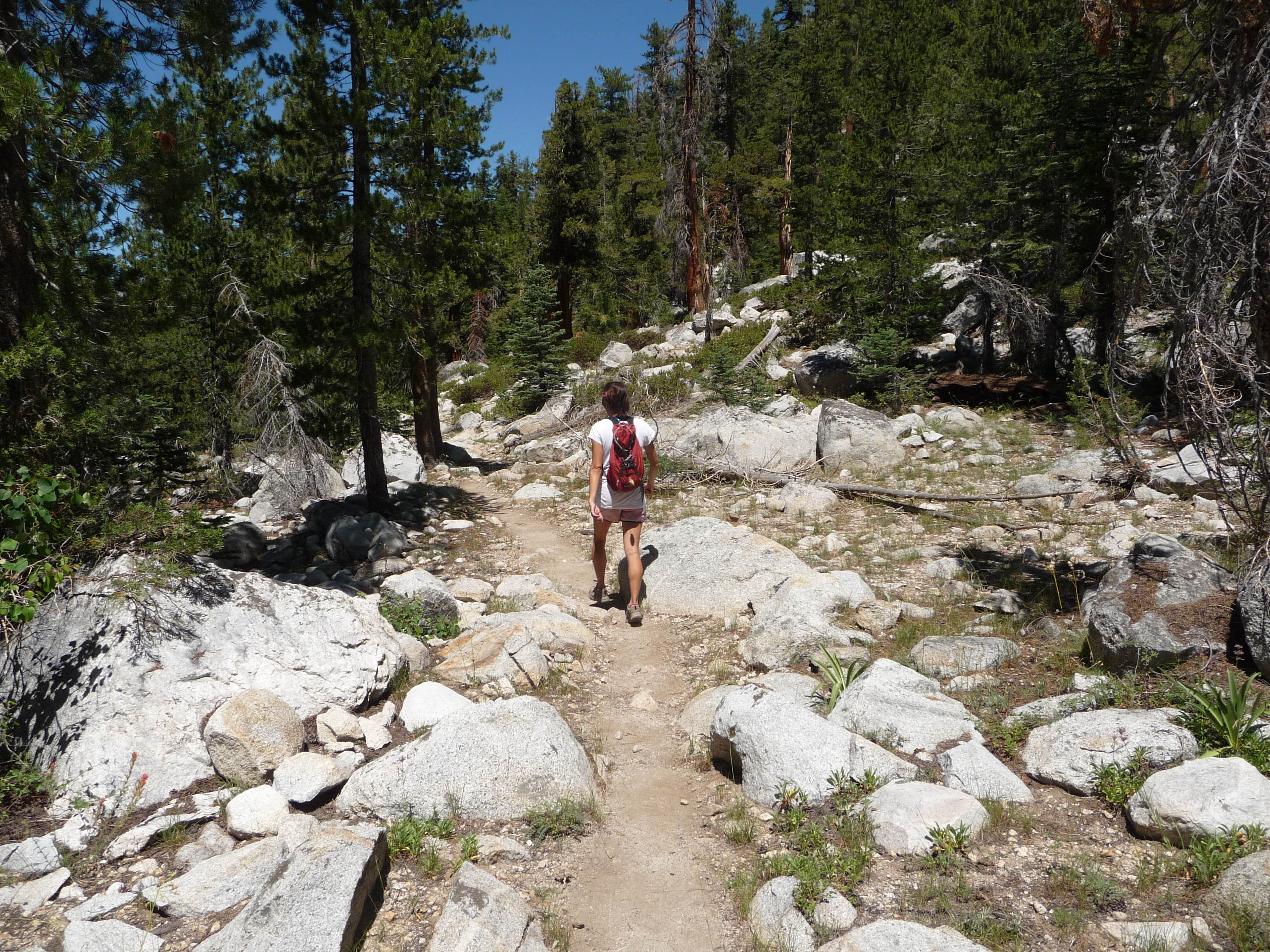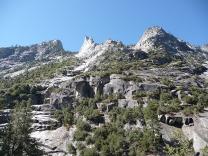 The next fork we encountered was the jumping off point for the Rae Lakes Loop if we had continued straight up Bubbs Creek, or for Avalanche Pass, accessed by the right turn we made at the junction. This also represented the first place where camping was allowed (with a Wilderness Permit, available at Roads End), and was a particularly beautiful, shaded, insect-free place. There were bear bins on both sides of the river and a wide variety of flat places for tents to be pitched. As we were day hiking, we pressed onward up the third watershed of the day, Sphinx Creek itself.