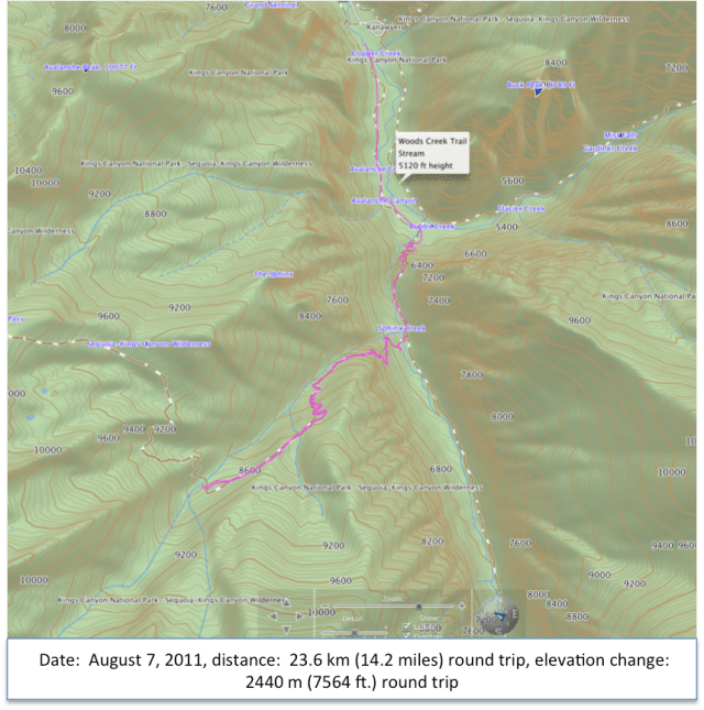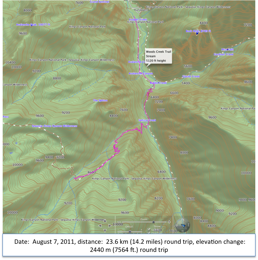 An early start allowed us to park at Roads End once again and to be on the Woods Creek Trail well before the hot part of the day. This trail was the very same one that took us to Mist Falls the day before except that we would take a right turn where the trail split at the junction of Woods Creek and Bubbs Creek. We had always wanted to hike the south side of the valley toward the formation known as The Sphinx.