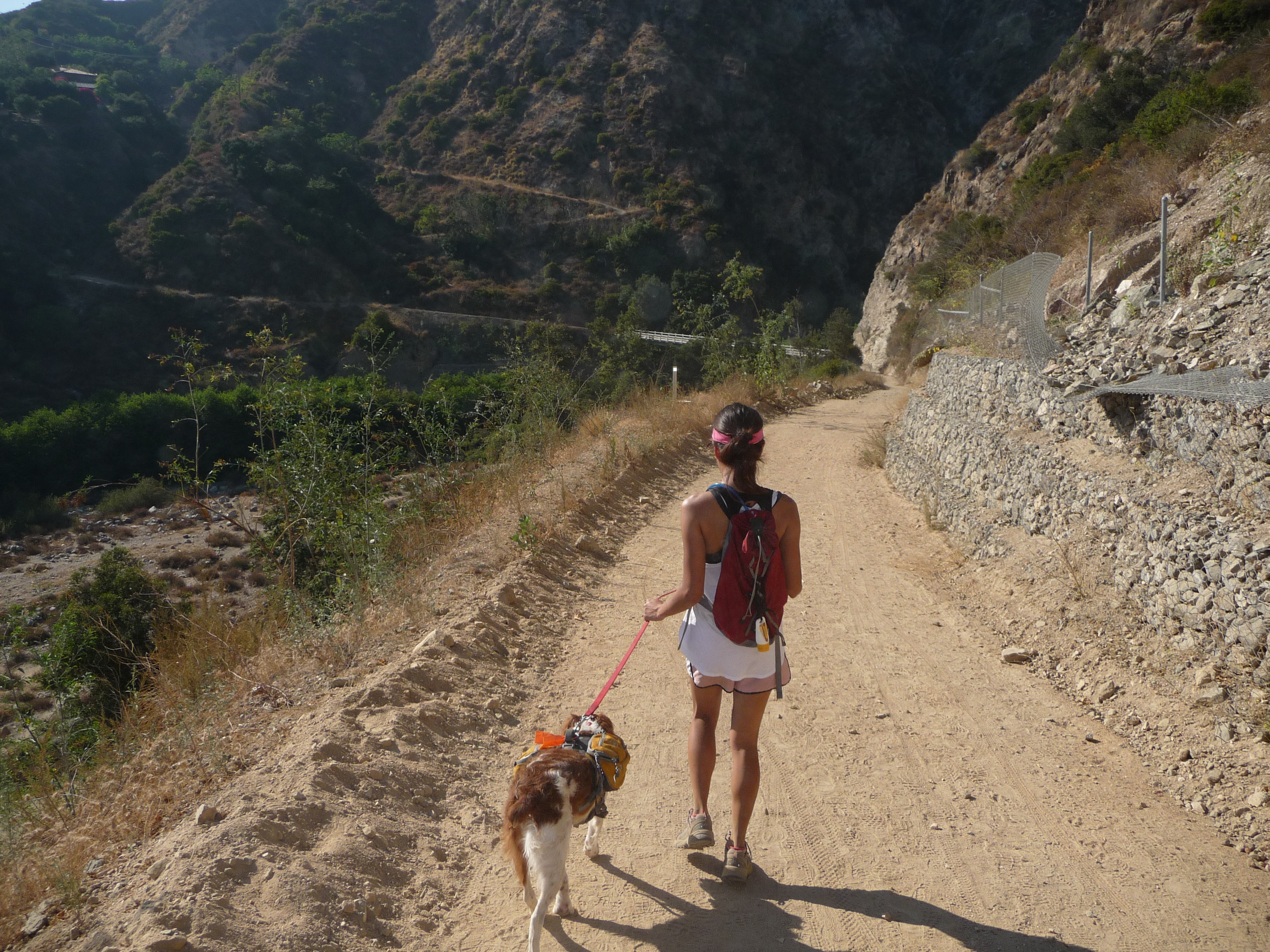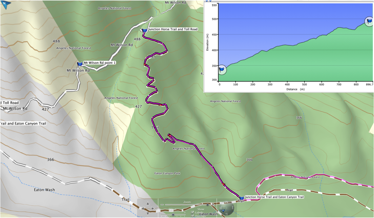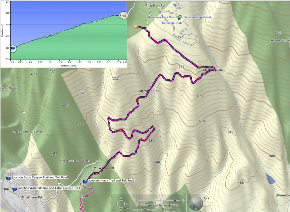 Our favorite way to return from Henninger Flats is to remain on the Mt Wilson Toll Road past the Horse Trail to avoid the steepness that can be a challenge with dogs on leash. By taking the longer way down, the footing is much better and the additional distance is only 1.9 km (1.1 miles). As the trail reaches the junction of the Eaton Canyon Trail, there are three options: