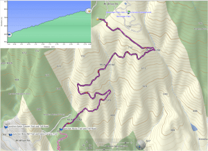 We left the crowds behind when we turned right on the Horse Trail at the 1km (.6 mile) point. The Horse Trail is the local name for a 1 km (.6 mile) short, narrow and steep trail that forms a cutoff connecting the Mt Wilson Toll Road with the Eaton Canyon Trail. Taking this trail is a tough way to start a hike and we are usually winded in the first few minutes. The elevation gain, however, is the payoff as the top of the trail is the first opportunity for a great view. In the short 1 km that it runs, this trail gains a whopping 155 m. (480 ft.). Make no mistake, this trail is tough for those who don’t normally hike. Going down is equally challenging, as the trail is degraded by water runoff and dense vegetation.
