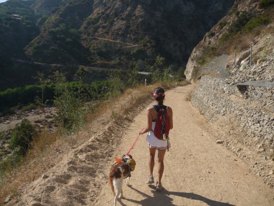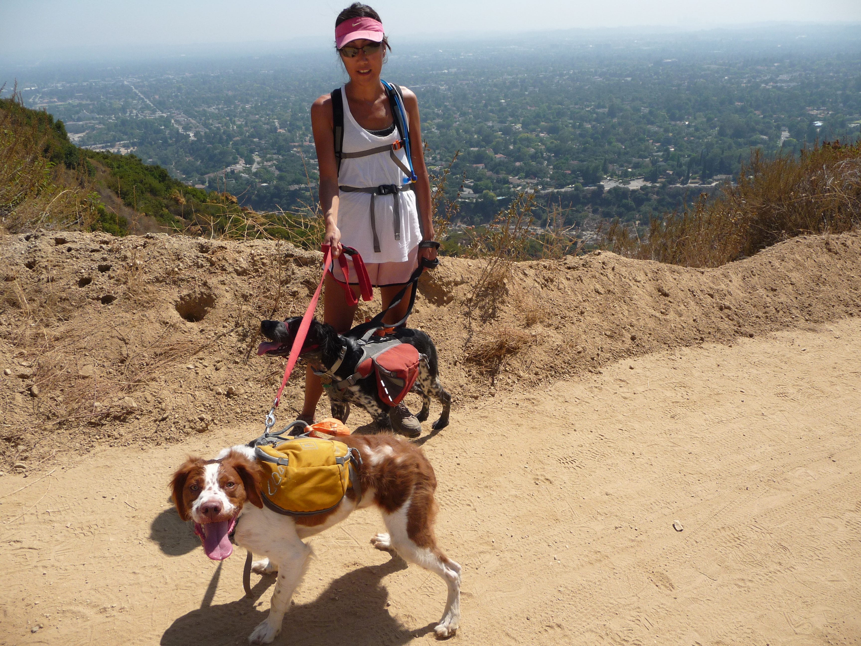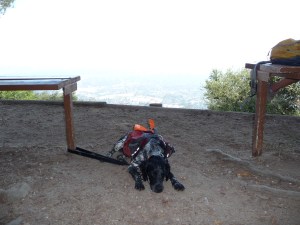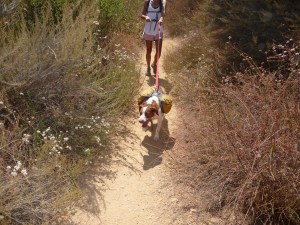 The trail was hot and dusty when we started walking at 2:30 in the afternoon. We made sure the dogs had plenty of water before starting, but even so, they started panting and looking miserable within a few minutes of getting on the trail. Our solution was a trick we saw in brittany field trials…we used our Camelbaks to soak Gwenn and Mitch’s heads, which worked very well and we had energetic, eager dogs in short order.