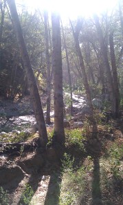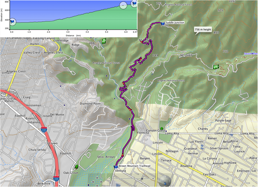 The saddle is the junction of the Brown Mountain Trail with the trail that comes up from Millard Canyon to the east. It is a flat area with shade trees and a great breeze and naturally becomes the place for people to take a break whether on bicycles or on foot. At the time we hiked, the trail upward toward Brown Mountain had a closed sign but the trail down to Millard Canyon parking lot was open. Somewhere nearby was the end of the El Prieto trail, but we weren’t able to find it. The dogs enjoyed a extra helping of water as the day was still quite warm and we soon headed back down the trail toward Pasadena. This is a great trail if you want to log distances without too great of a climb and it is very local to Pasadena with parking at the trailhead.