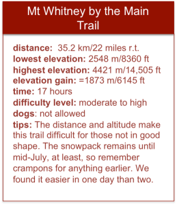 The gritty part of climbing Mt Whitney, besides distance and altitude, is getting from Trail Camp to Trail Crest at 4200 m (13,777 ft), which seems to be not so far below the summit, but there’s something a little misleading about the last section of the trail…it goes down and up, so the actual vertical distance hiked to Mt Whitney’s summit is higher than the difference between the summit and the Portal.