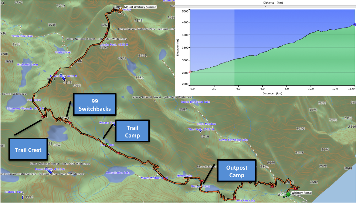 We successfully climbed Mt Whitney the year before, in September 2008, by the same route but in two days rather than one. Knowing how much more weight is required to camp overnight (which includes a bear bin, per the park rangers), we were eager to see how much faster and lighter we could travel by making a one-day attempt. This turned out to be the way to go.