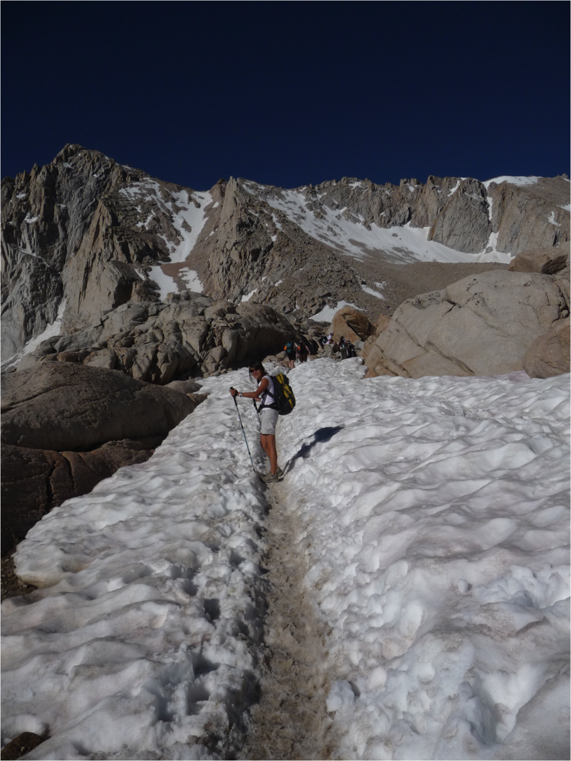 The gritty part about getting to Trail Crest lies in climbing up the “99 Switchbacks”, but how many there actually are depends on when you start counting and what constitutes a switchback. We counted 107 the year prior, and others have adamantly claimed 97. I guess 99 is just a great number to remember and recite. You know you’ve bested the switchbacks when you reach the cable that helps hikers cross an otherwise treacherous slab area just below Trail Crest. When we arrived at that point on the morning of July 4th, there was considerable snow forming a large cornice that made crossing a matter of leaning away from the hill while gripping the cable, with nothing but open drop below us. We saw several people turn back rather than cross that spot.