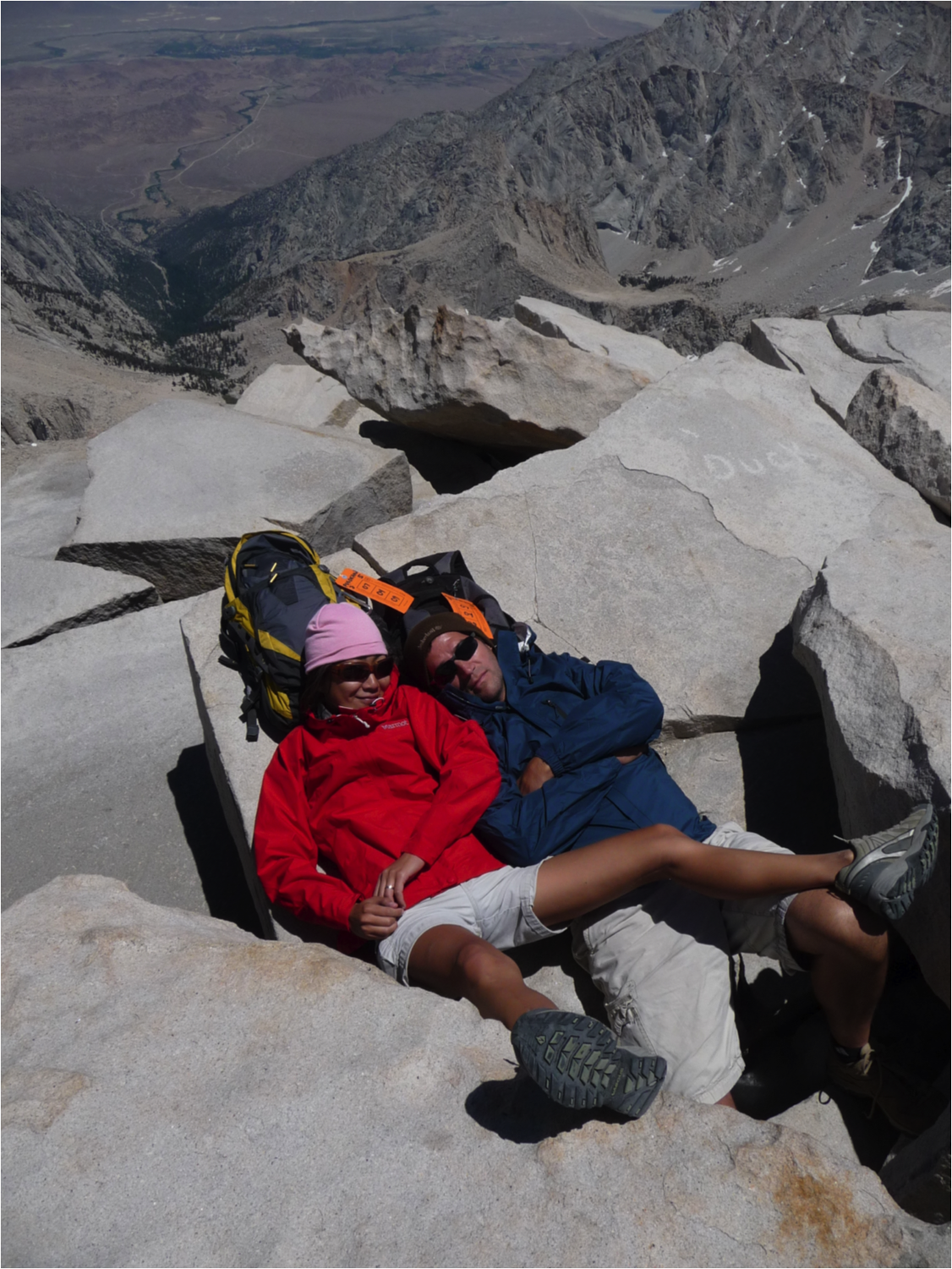 Anyone who has hiked much will tell you that getting to the top isn’t the most challenging part of climbing mountains. Getting down is where the accidents happen and where most of the pain occurs. Knowing this, we laid down on the rocks to take a break for a while rather than starting down right away. It was cold but sunny, and with our jackets on, tucked into the enormous rocks that form the summit, we were soon napping comfortably at the highest point in California. If you make it this far, plan to do the same, as it feels great to take a break and will certainly help make the return trip safer. After thirty minutes or so, we left our comfortable refuge and headed down. The trip down was long but uneventful. Another adventure.