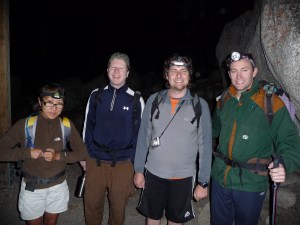 To complete this hike in one day requires well before sunrise and we chose to to step onto the trail at 3:30am. It was dark but not very cold as we weighed our packs at the trailhead, just below the Portal Store. It was fantastic to have 7 kg (15 lb) packs rather than the previous year’s 21 kg (47 lb). It didn’t escape me that I was celebrating our Independence Day by climbing with a group entirely made up of French.