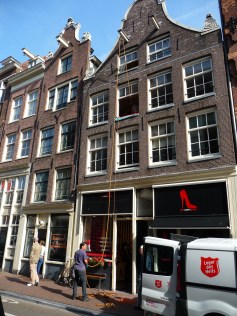 Something we’d witnessed on The Amazing Race but never in person was the way the tall and narrow canal houses of Amsterdam present a particular problem for moving furniture. With steep and narrow staircases, large items must be hoisted from the street using hooks attached to the top of every house and brought in the large front windows of the upper levels. It was only after we saw the movers in action that we realized that every single tall, narrow house had the same mechanism. In Amsterdam, that means nearly every house in the city.