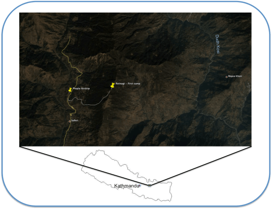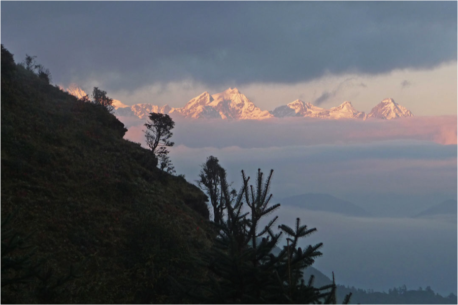 Once our lunch concluded, we hiked to the east for a few hours to the top of the 3,000 m. (about 10,000 ft) mountain above Phaplu, stopping at a place called Retnagi (meaning red, bare land, which was very accurate). This was our first campsite and provided us with a great view to the east of the Dudh Khosi, the main river of the Solukhumbu region that flows down from the Mt Everest drainage to the northeast. Through the clouds, we could clearly see snow covered peaks of the Himalaya in the distance, but what appeared to be lower peaks, not the 8,000 m. peaks we were eager to see. Within minutes of stopping, our tents were set up in a flurry of activity, and we were left to talk and relax before dinner.