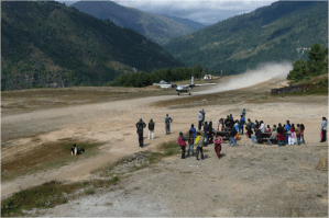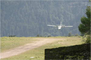 Soon after and from some distance away, we saw the dirt strip and made a low pass to the right and parallel to the runway and the village of Phaplu before taking what was a course directly toward the tallest mountain. At the very last moment and with the GPS flashing a warnings again, we banked hard left and began a very fast descent to the air strip. The pilots left the flaps up until nearly touchdown so that they could maintain speed just in case they didn’t set down at the early enough and had to take off again. There was a mild bump as we touched the ground and we came to a very quick stop.