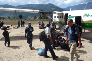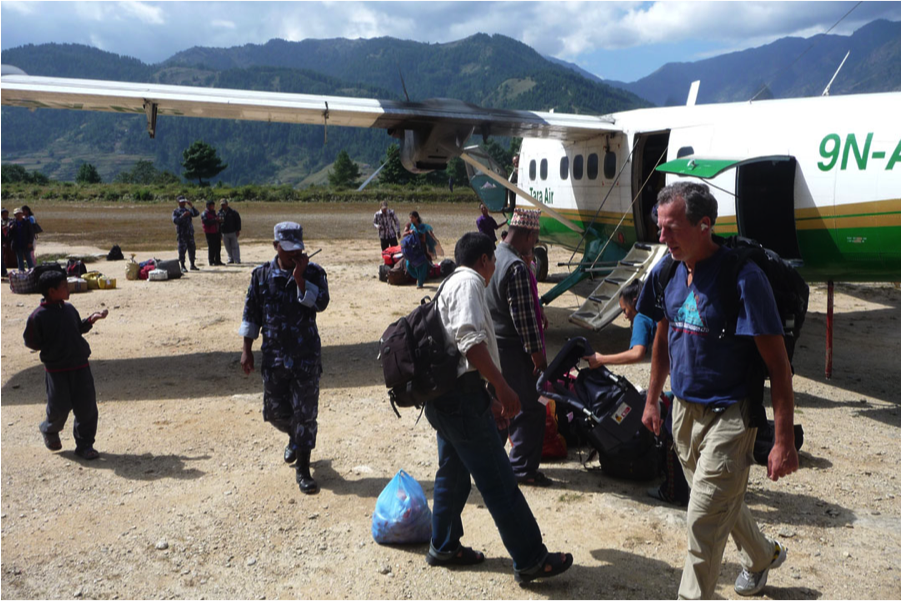 As we reached the offloading area (there was no terminal), there was a crowd of Nepali people and cargo awaiting our arrival. Even better, the ‘gate’ consisted of two wooden picnic tables. Within minutes, the aircraft was reloaded and taxiing back down the strip for takeoff. Before we left the short walk from the plane, it was taking off behind us. Curiously, the only ‘official’ presence was the single soldier monitoring the passengers and also manning the small gate in the chain link fence that allowed people to pass in and out of the ‘ramp’ area.