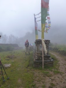 We had been walking in the mist all morning except for a brief view of blue sky at Panggom. From Panggom, we continued uphill until we reached 3185 m at a bench and buddhist prayer flags that marked Banjang, a Sherpa word for “pass”, which is also known as “la” in other parts of Nepal. From Banjang, we made our way steeply down to the village of Subijee at 3011 m. By the time we reached the village, our kitchen staff had already arrived and was set up for lunch at just 11am. Most significantly, the pass we crossed took us out of the valley of the Dudh Kosi and its Rai population and into the Hinku Valley, home of Sherpa people. This valley would take us the remainder of the way to Mera Peak.