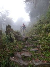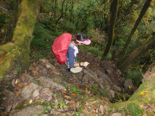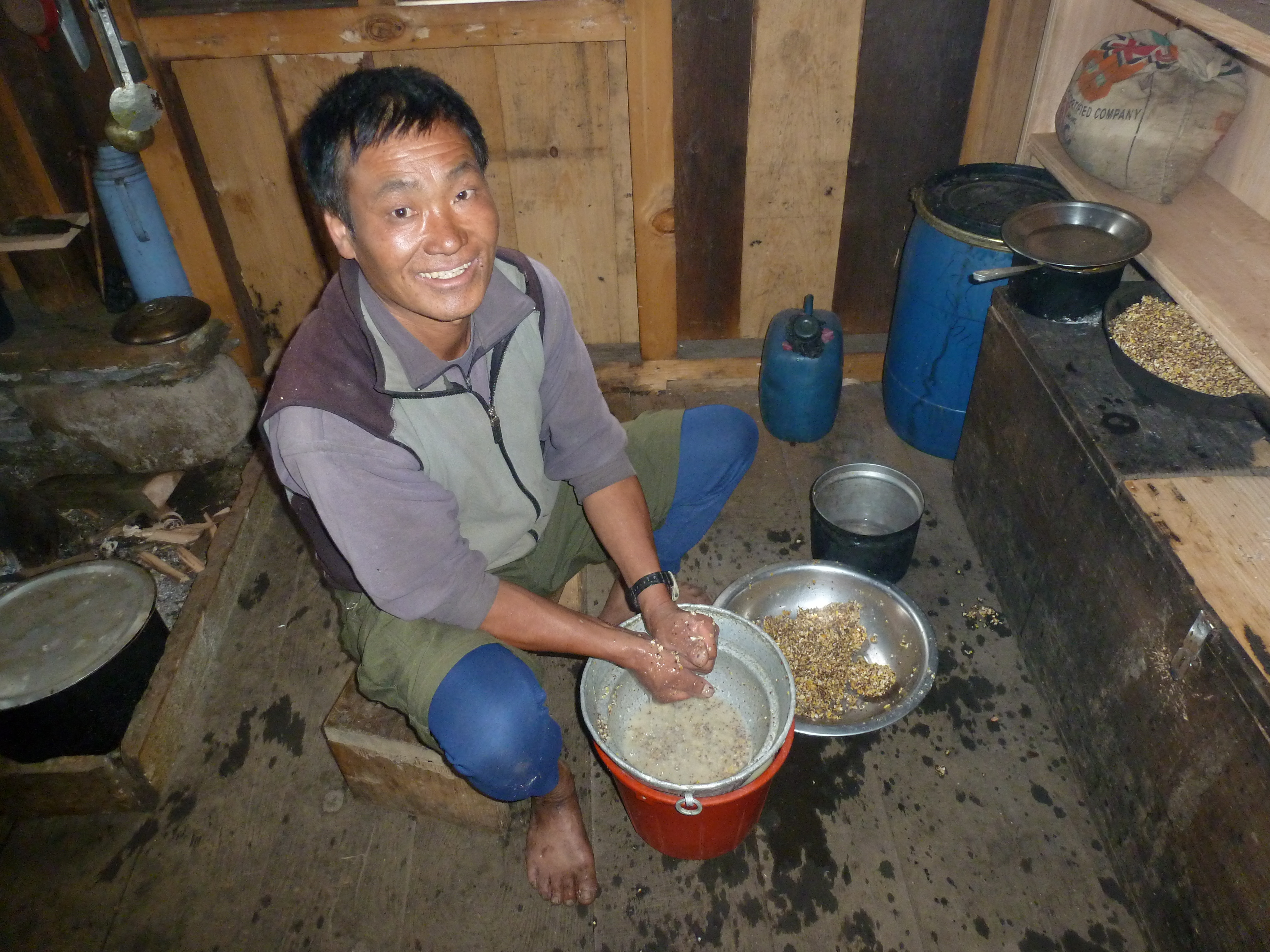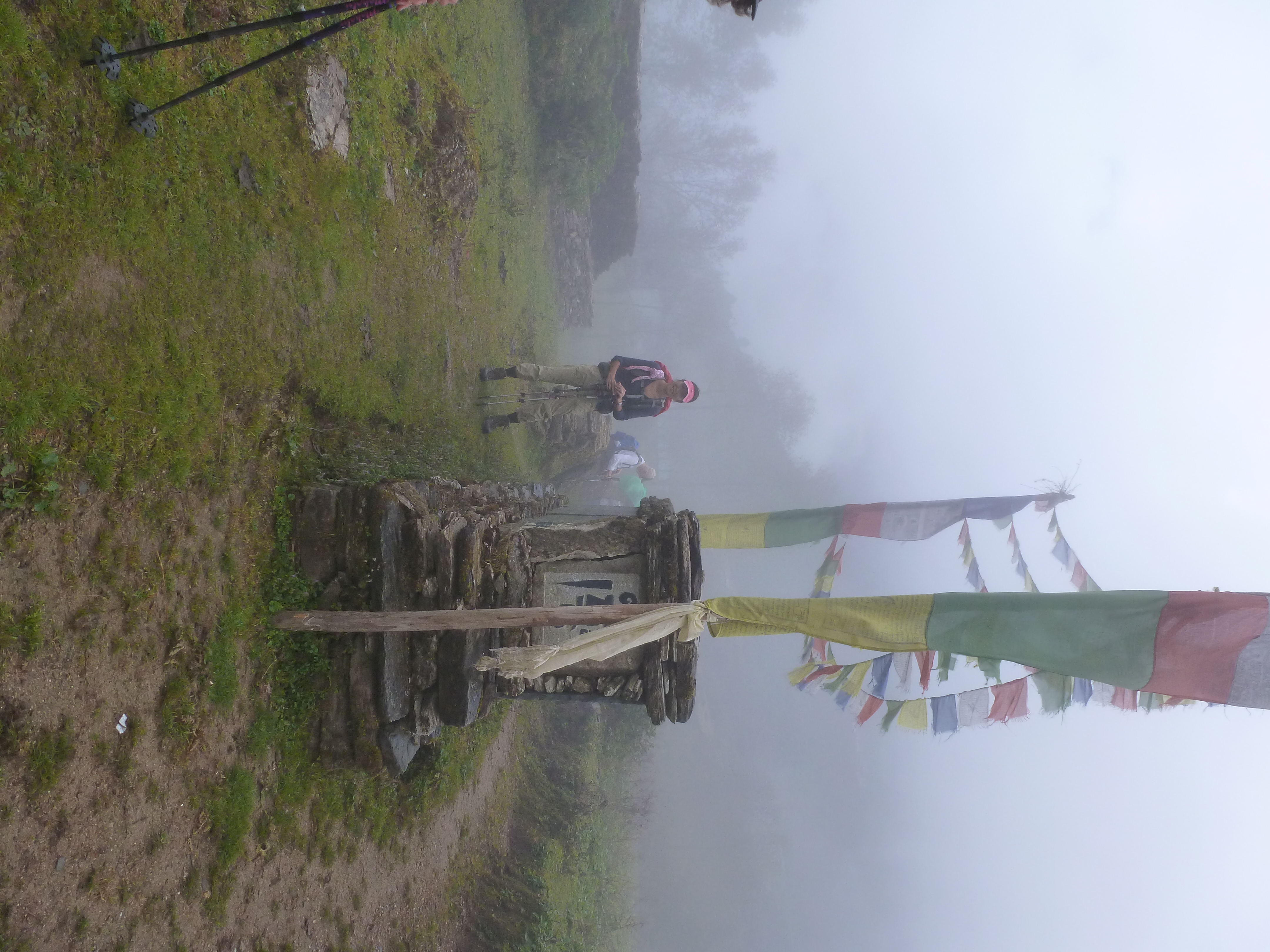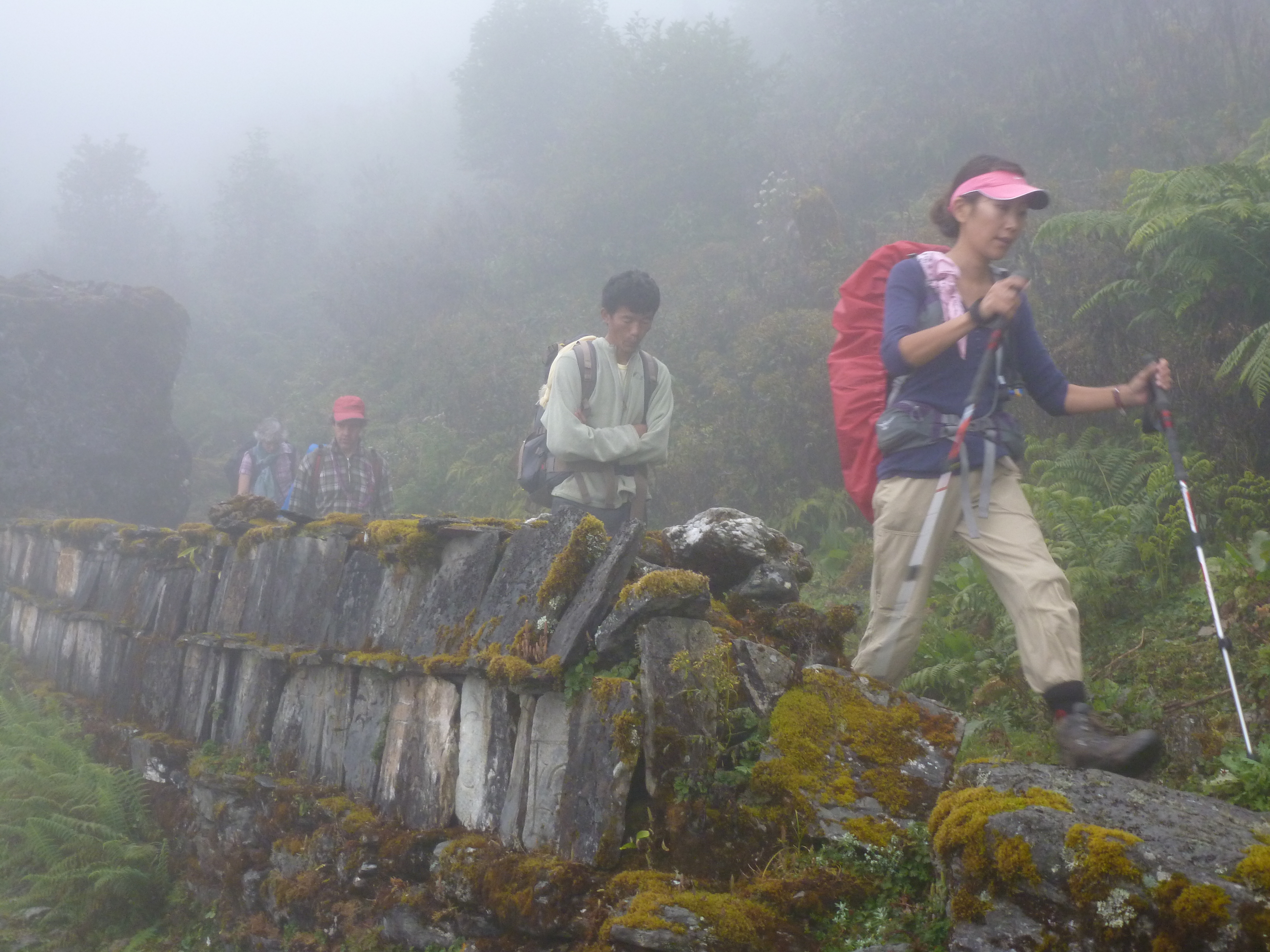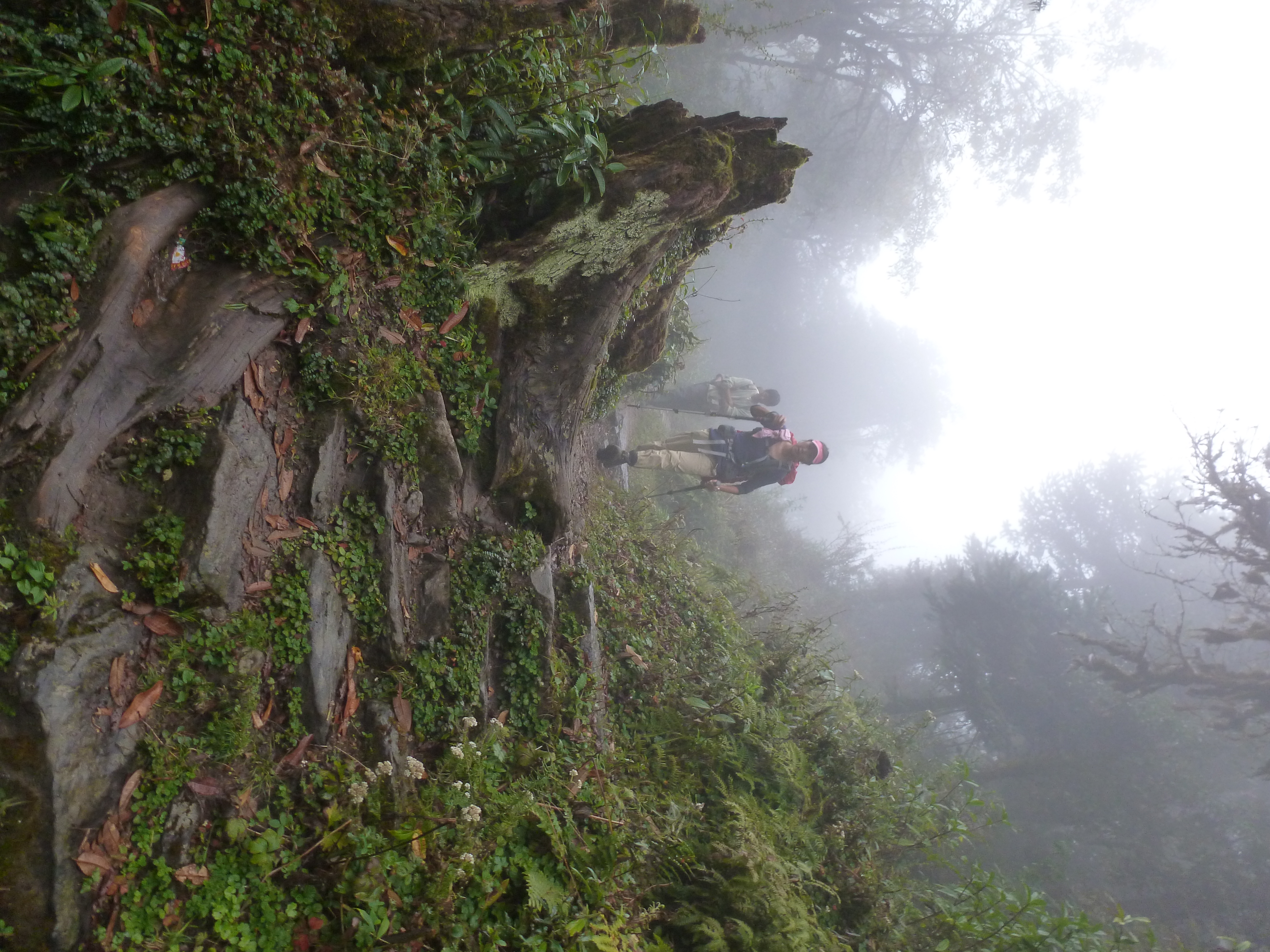 Our hike began with as it ended the day before, by going up a slippery and steep trail. At times the trail was the same as the stream bed and quite muddy. We walked for about two hours to the village of Panggom, where phones still worked and our last texts were sent. We took a short break and were served a sweet black tea that refreshed us and had us ready to cross the mountain above us. It also warmed us up in the damp cold of this higher elevation.