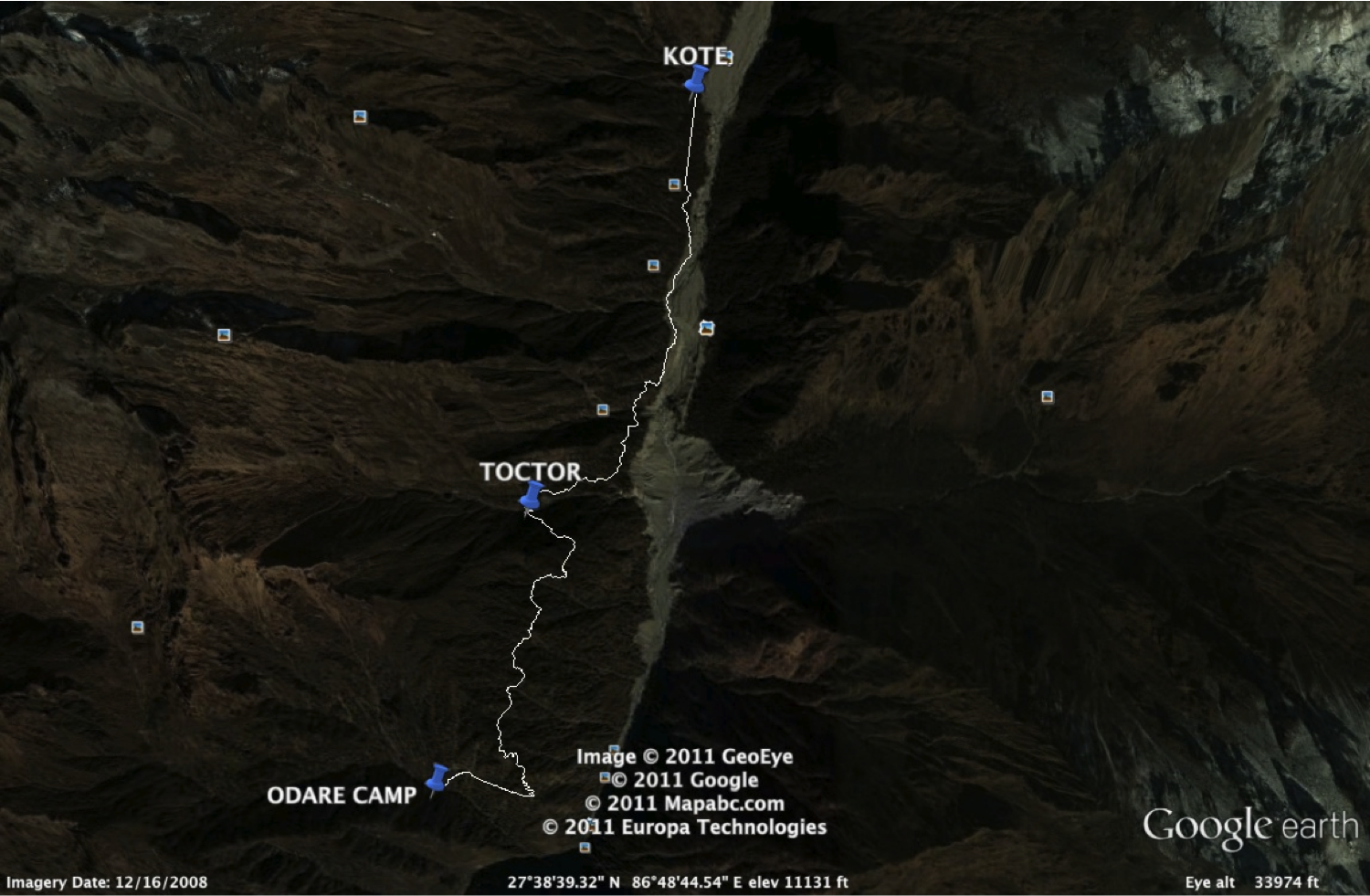 Not too far from the river, we came to the village of Kote and saw our first tents and trekkers since leaving Kharikhola. We were high on a plateau above the river with an intermittent view of snowy peaks to the north. There was a picturesque waterfall high above the village and an excellent opportunity to buy packaged foods. Clouds were moving up the Hinku Valley from the south, giving alternating glimpses of the peaks to each side of the river and also of Mera North and Mera Central. It was exciting to think that if everything went according to plan, we would be on Mera North at 6476 m (21,246 ft) in just four days. We spent time walking around Kote and taking in the sights.