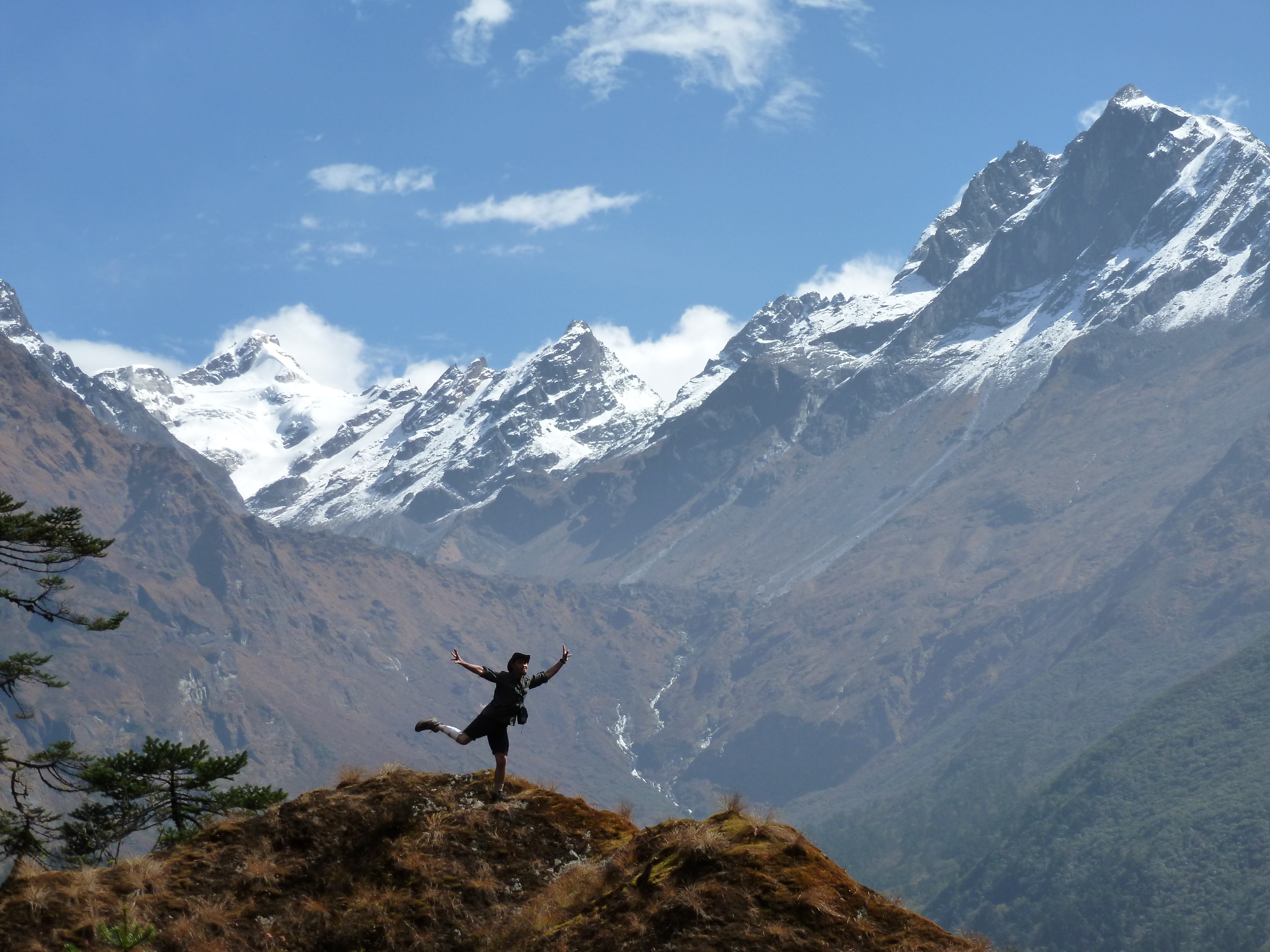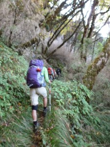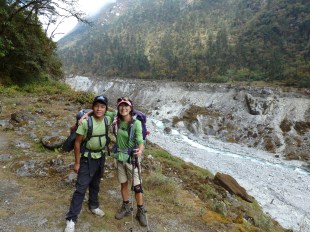 From lunch, we trekked mostly downhill to the Hinku Khola and then followed the glacial snowmelt river for a few kilometers before once again climbing into the forest along the west side of the river. It became obvious during the afternoon that we were leaving behind the temperate part of Nepal, with its bamboo and rhododendron forests and were now seeing the beginning of a true alpine climate with pine trees and rocky soil.