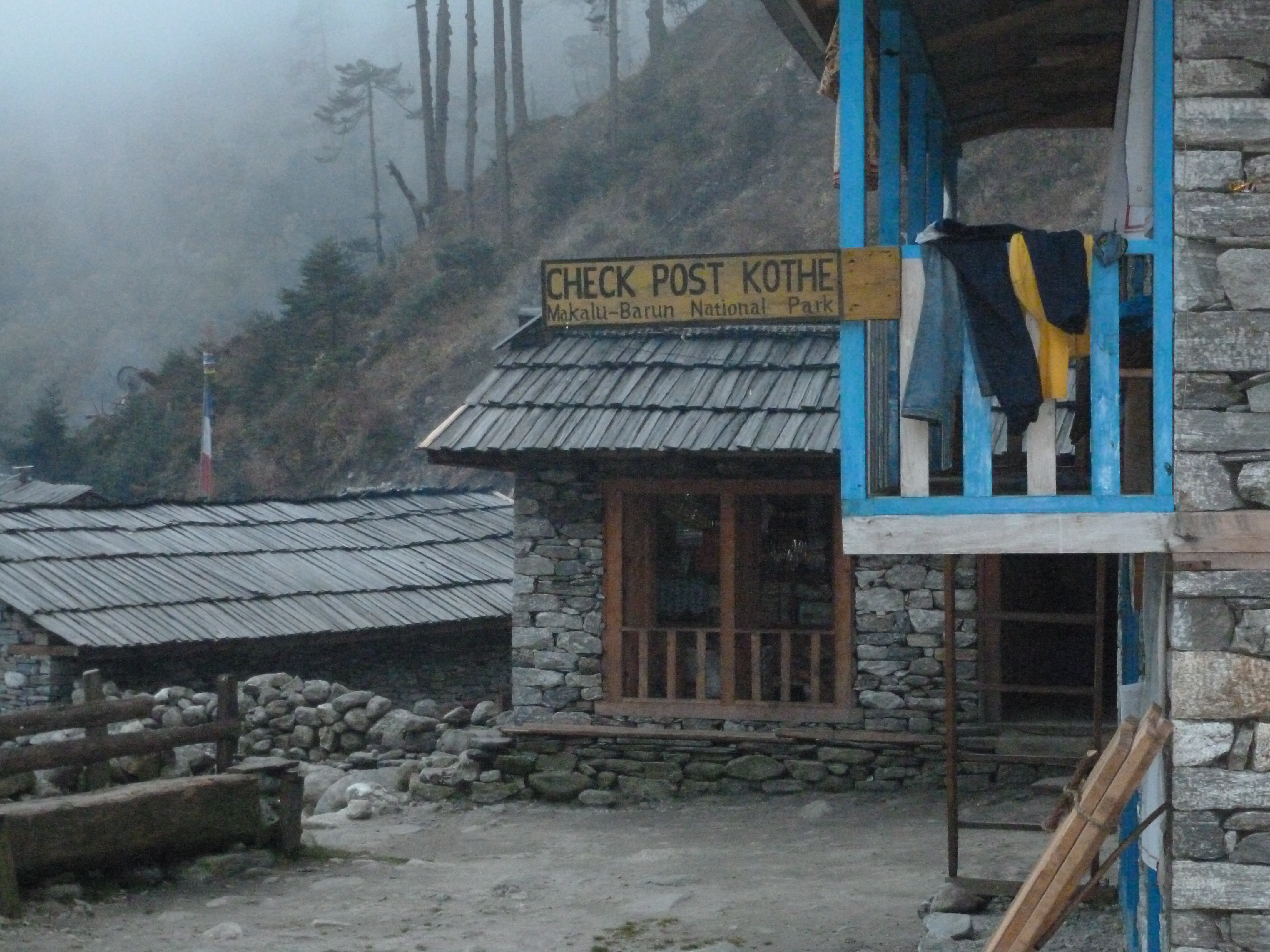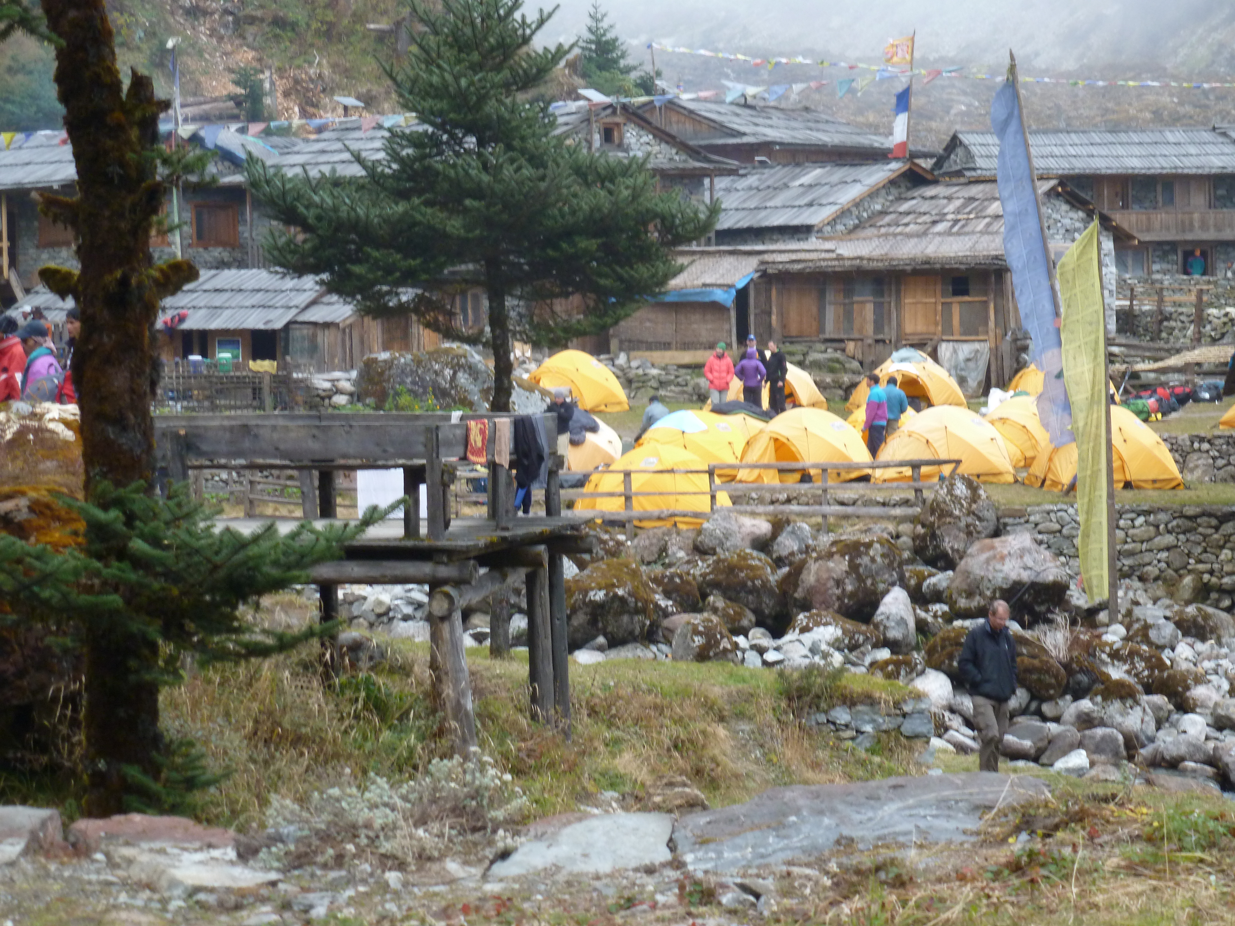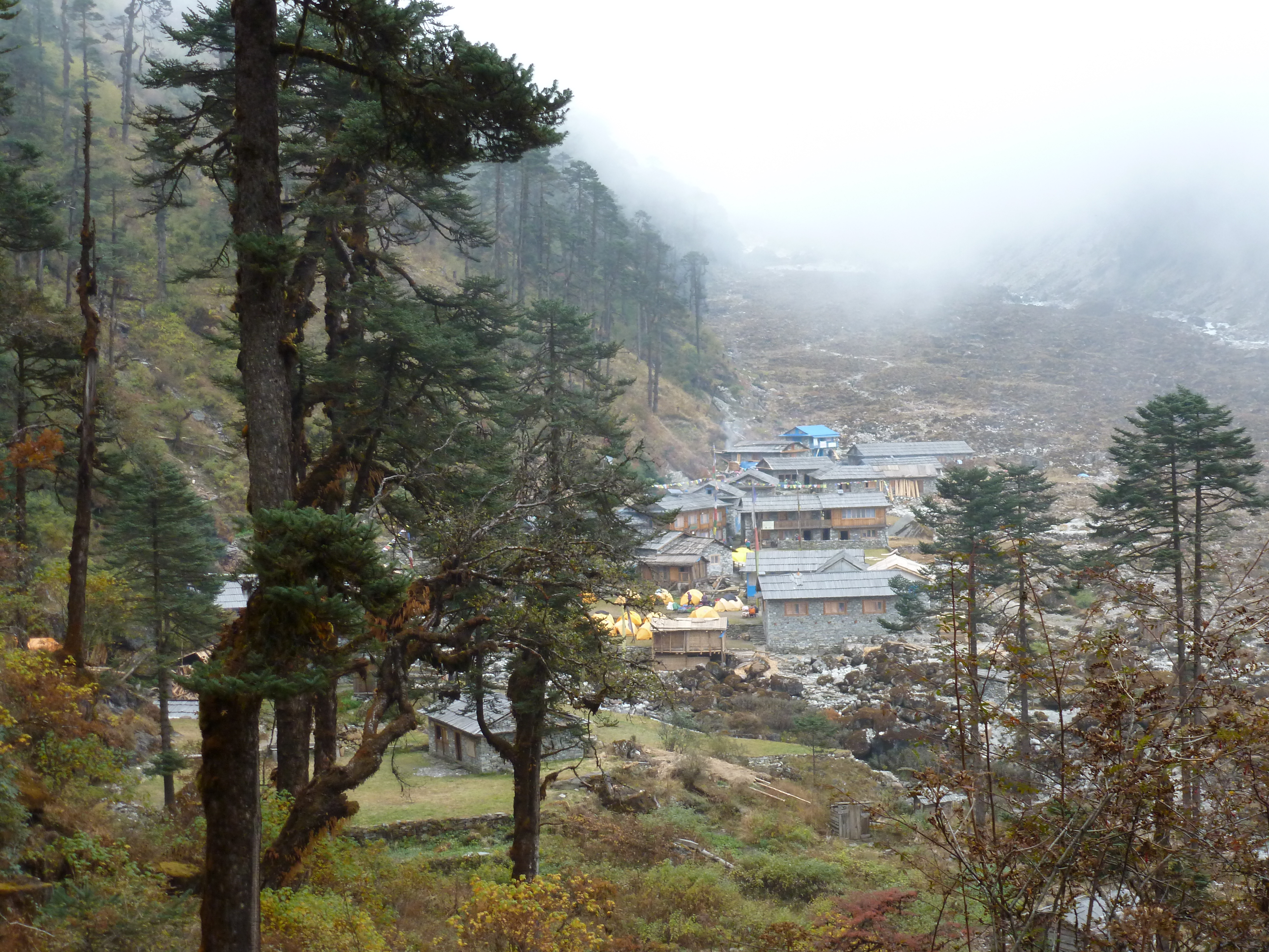 We had an excellent dinner of rice, lentils, pototoes and pork (undoubtedly the same pig we saw being carved) before DB came by to talk about our plan for the next few days. There was a lengthy conversation on whether to take Diamox, with the guides recommending against it. We also planned not to sleep at Base Camp but to instead hike from Khare to Base Camp and back down as an acclimatization exercise, and then hike from Khare to High Camp the day before the summit attempt. With the air cold now, we layered our clothing and still shivered in the 3600 m (11,811 ft) air. The cold, however, added to our excitement as we had a much stronger sense of how close we were to the highest altitude of our lives. Just as we unlayered our clothing and prepared for sleep we heard the rain on the roof of the tent once again.