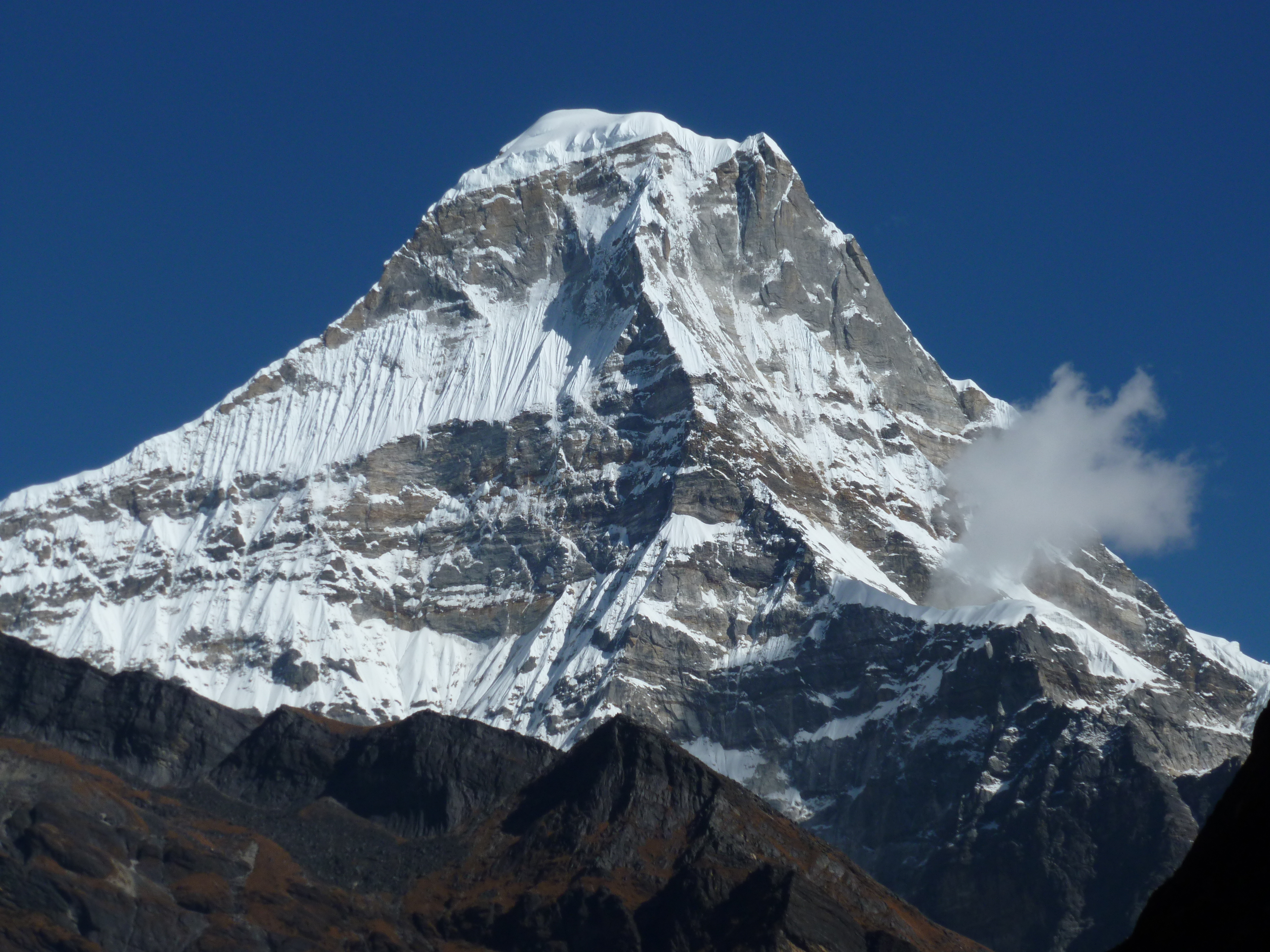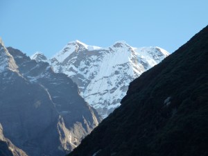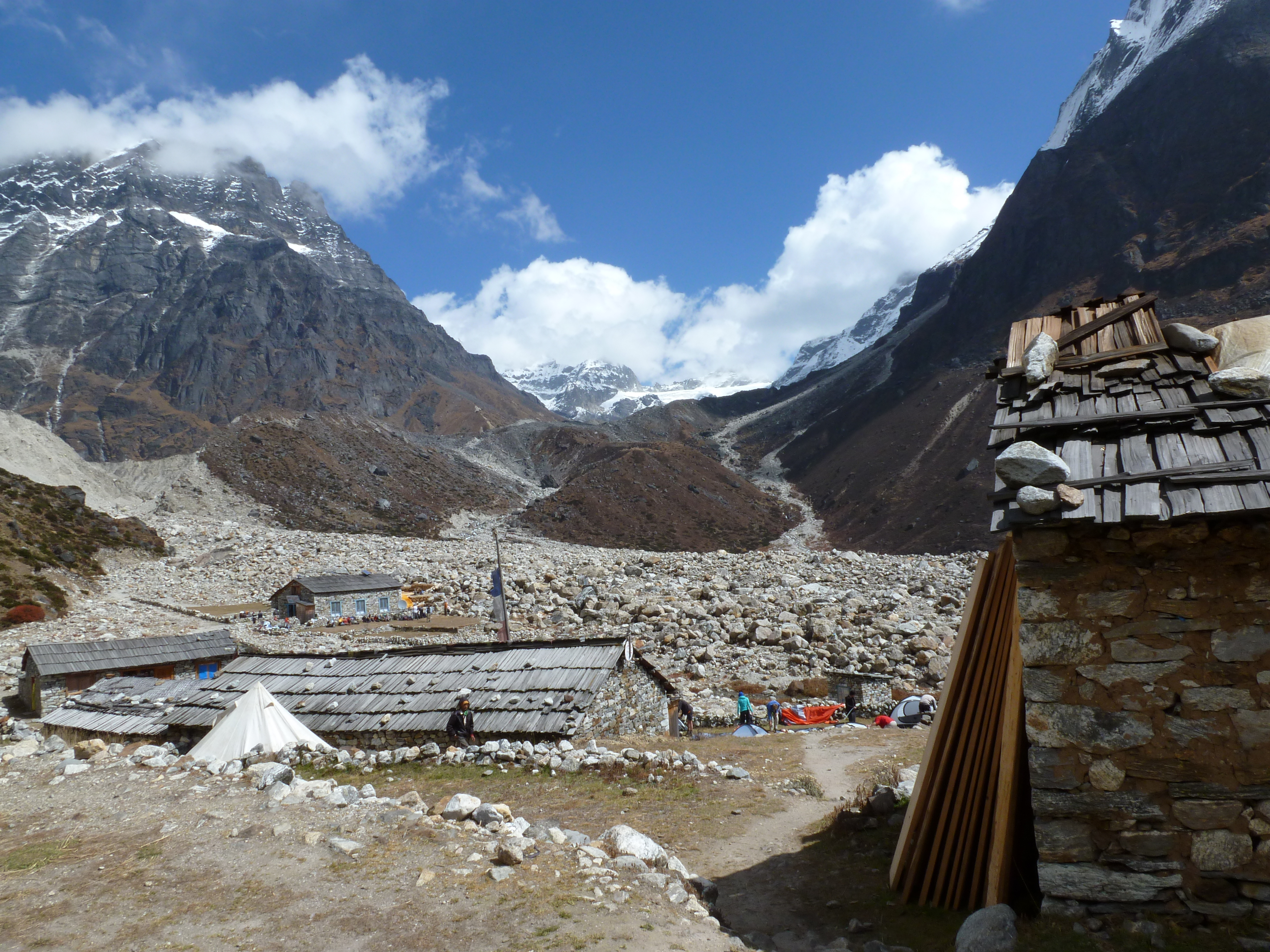 Soon after leaving Khote, we were treated to an excellent view of Tangtse, a nearly perfectly pyramid-shaped peak that was dead center in the direction we were headed. Most of the 6770 m (22,211 ft) pyramid was snow and ice covered with hanging serac at the base. As we climbed higher, we were able to see beyond the largest peak to our left, Kusum Khangkaru, at 6370 m (20,899 ft) and had an excellent view of the Lungsamba and Tangnag Glaciers descending from the peak. The Hinku River gorge was very wide at this point and steep-walled, with the trail at times at the very edge of a significant drop to the river below.