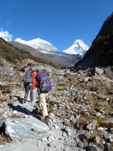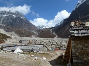 The morning sky was clear and the peaks of Mera were lit up by the sun that hadn’t yet reached the narrow Hinku River Valley. Our camp was on the moraine left by the retreating glacier that departed this valley many years ago. The variety of large and small boulders, all covered with a thick layer of moss, the prayer flags of Khote, and the fringe of pine on the sides of the valley combined to make this appear an idyllic alpine place and provided a reminder of how high we really were. We started walking at 7:30am, per the usual schedule and followed along the west bank of the river, periodically crossing streams coming in from the mountains to our left.