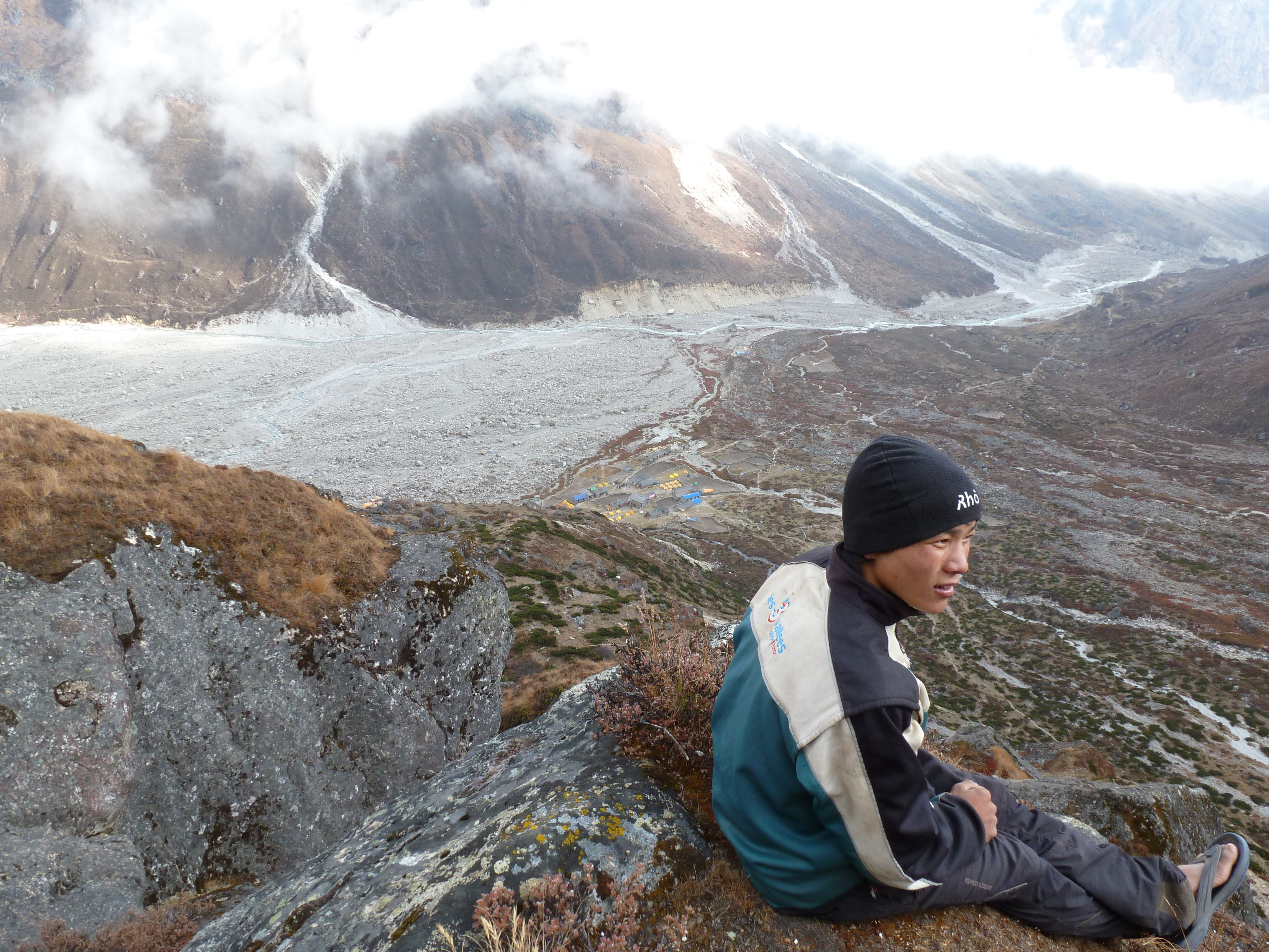 We arrived in Tangnag at 4300 m (14,108 ft) at 11:30am. It had been a short time trekking from Khote, but we gained nearly 500 m. The village was a seasonal site existing mainly to support trekkers hiking over the Mera La and to Mera Peak, to the east and high above the village. There were about ten permanent buildings and there were no longer glass windows, as every opening on the buildings was covered by plastic instead. We used the opportunity to rest and have lunch in one of the buildings while our tents were being set up on the terraces outsides. After lunch and as a way to acclimatize better, we decided to take a hike up the hill with just water bottles. We climbed to 4575 m (15,101 ft) before turning around and felt quite proud of ourselves until we met up with Karlin, who had left earlier and climbed to 5000 m (16,404 ft).