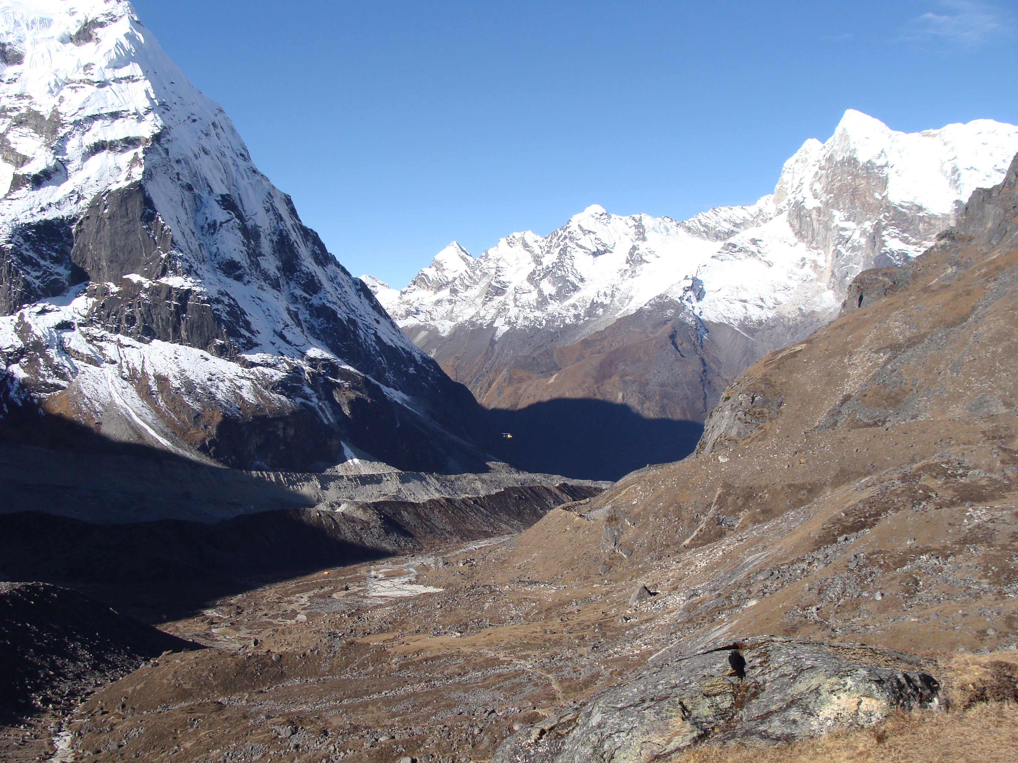 The helicopter struggled to lift off for a second before gaining a meter or so of altitude and then dropping quickly off the ridge and out of view as a way of gaining air speed. It appeared again much lower in the valley, above Mera Glacier and quickly disappeared out of view beyond Tangnag nearly 600 m (2000 ft) below us.