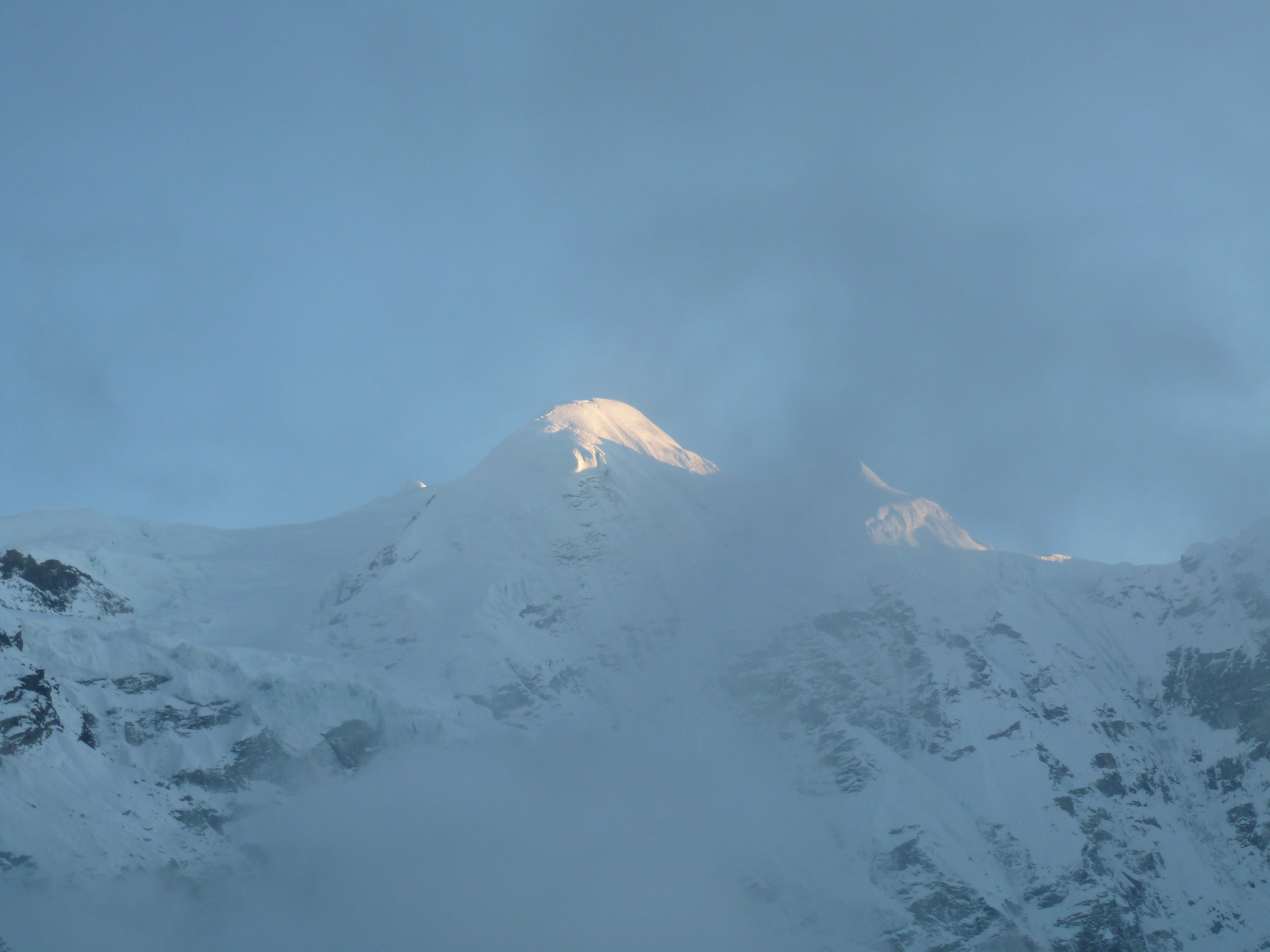 The morning started as our coldest yet, with the first light appearing at 5:30 am and the sun appearing over Mera Peak at 9am. Joel, Karlin and Chris were talking with an Indian climber who summitted the day before, and he mentioned that a member of his team had altitude sickness and would be helicopter evacuated before 9am. Our own Mike Miller had been talking for the past day about being taken out by helicopter as he didn’t feel well. On the trail, he was overheard the day before saying several times, “This would be a good spot to land a helicopter.”