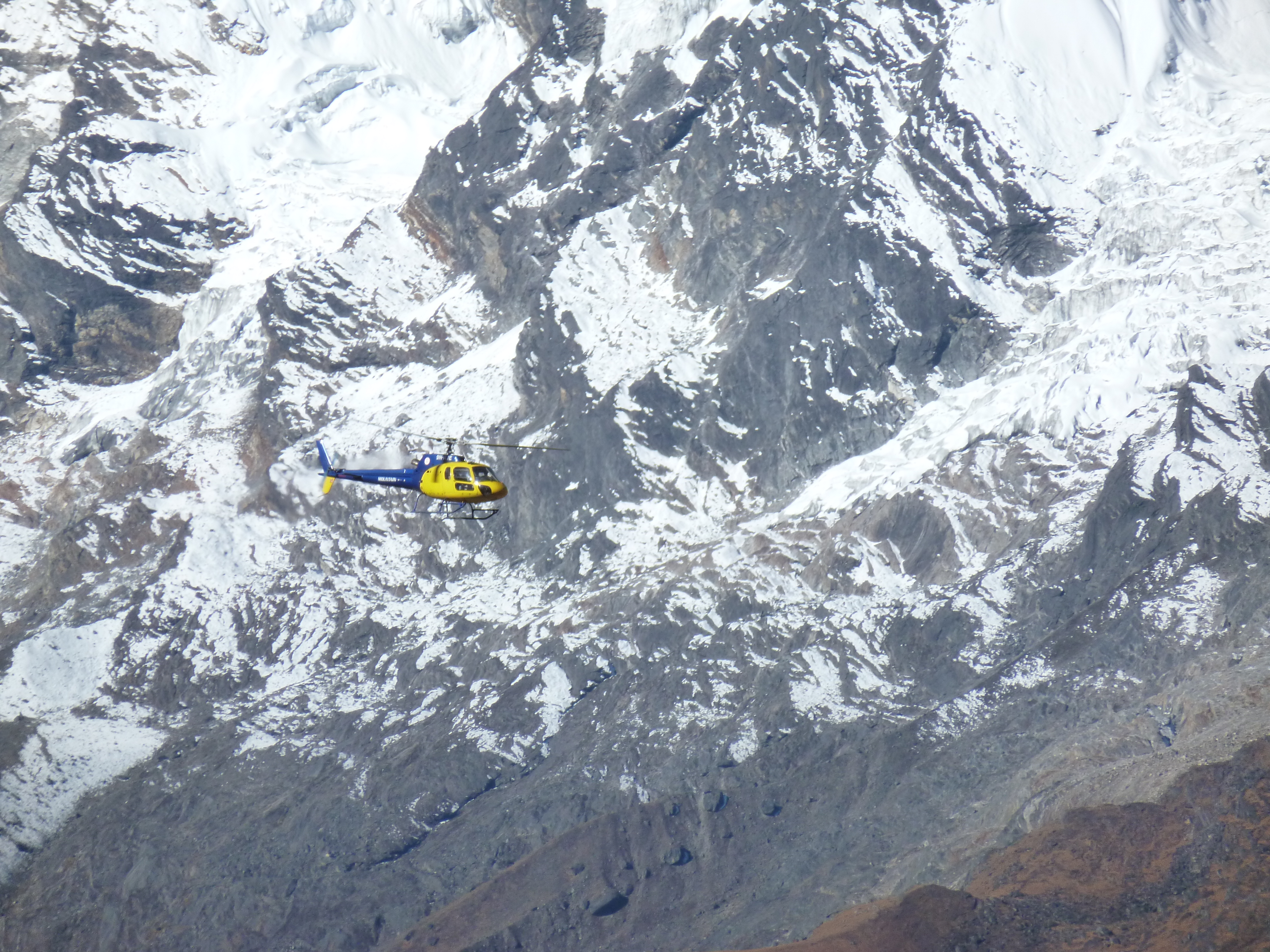 With that in mind, we quickly found Mike, DB and Buddi and let them know. Within a few minutes, calls were made to Kathmandu and just after breakfast the sound of a helicopter could be heard coming up the valley. It came in low in the valley as a way to put off climbing too high, too soon in the thin air.