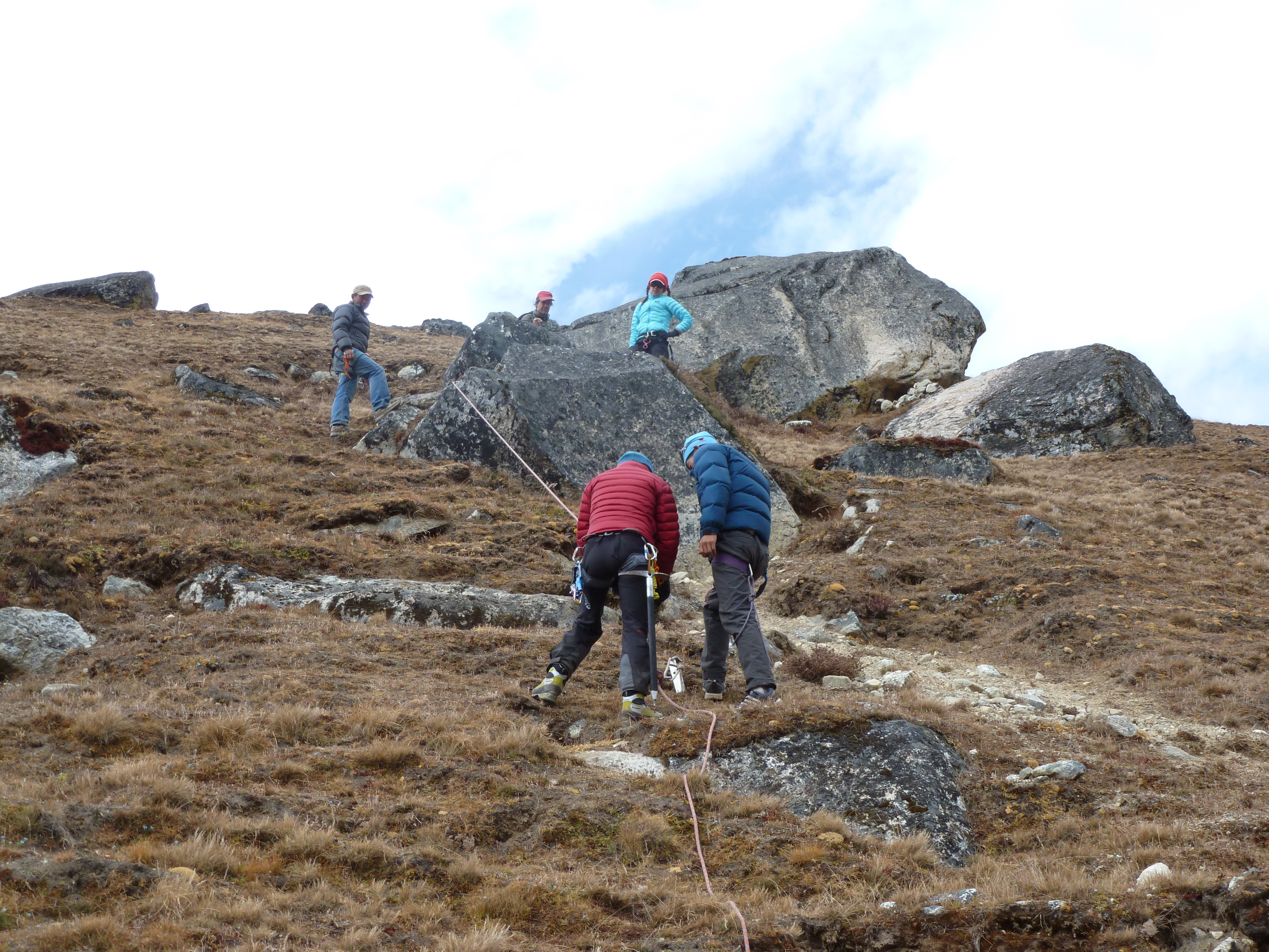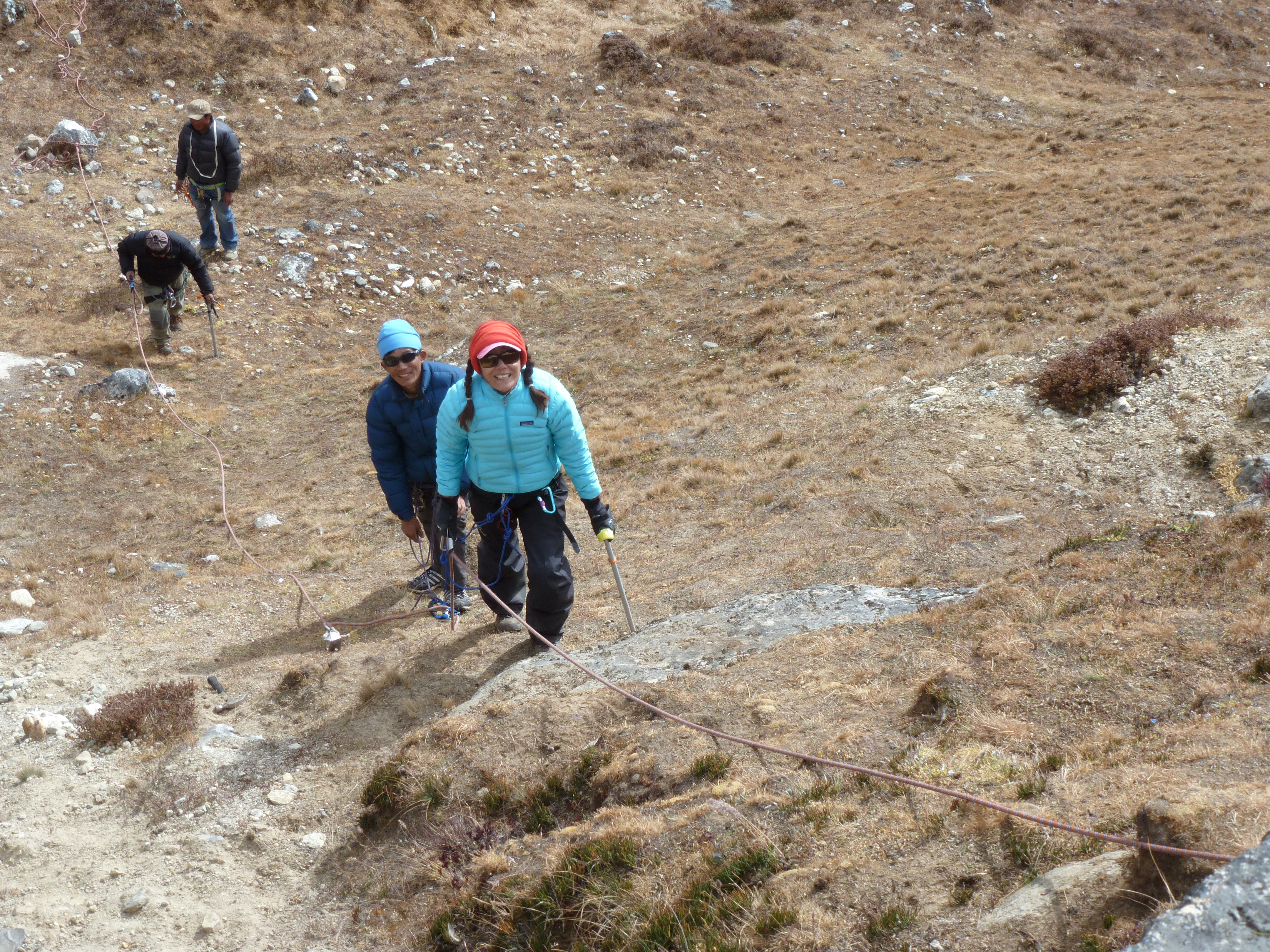 After lunch we did rope work with Pemba Dendi Sherpa, our local guide who was hired by Adventure Geo Treks. First we all brought out our equipment to make sure we were all set with climbing boots, crampons, ice axes, harnesses, carabiners, and an ascender/jumar. Once we did our inventory it was time to make sure safety lines were sized, cut and tied off at this lower, warmer altitude where thinking is clearer and we had time to prepare at a leisurely pace. We then made our way to a steep slope nearby where a rope was tied off, an intermediate stake fixed, and then each climber practiced rappelling and ascending using the prescribed methods of our climbing sherpa.