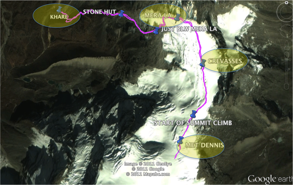 We also noticed gigantic crevasses all around that the trail carefully navigated. We had been told that there were no crevasses, but this was obviously poor information. You could drive a Winnebago into the ones we saw. If we had continued up the day before, the odds that we would have walked into a crevasse in the near white out condition on the Mera Glacier would have been very high. It was remarkable that the groups at High Camp successfully navigated their way down safely.