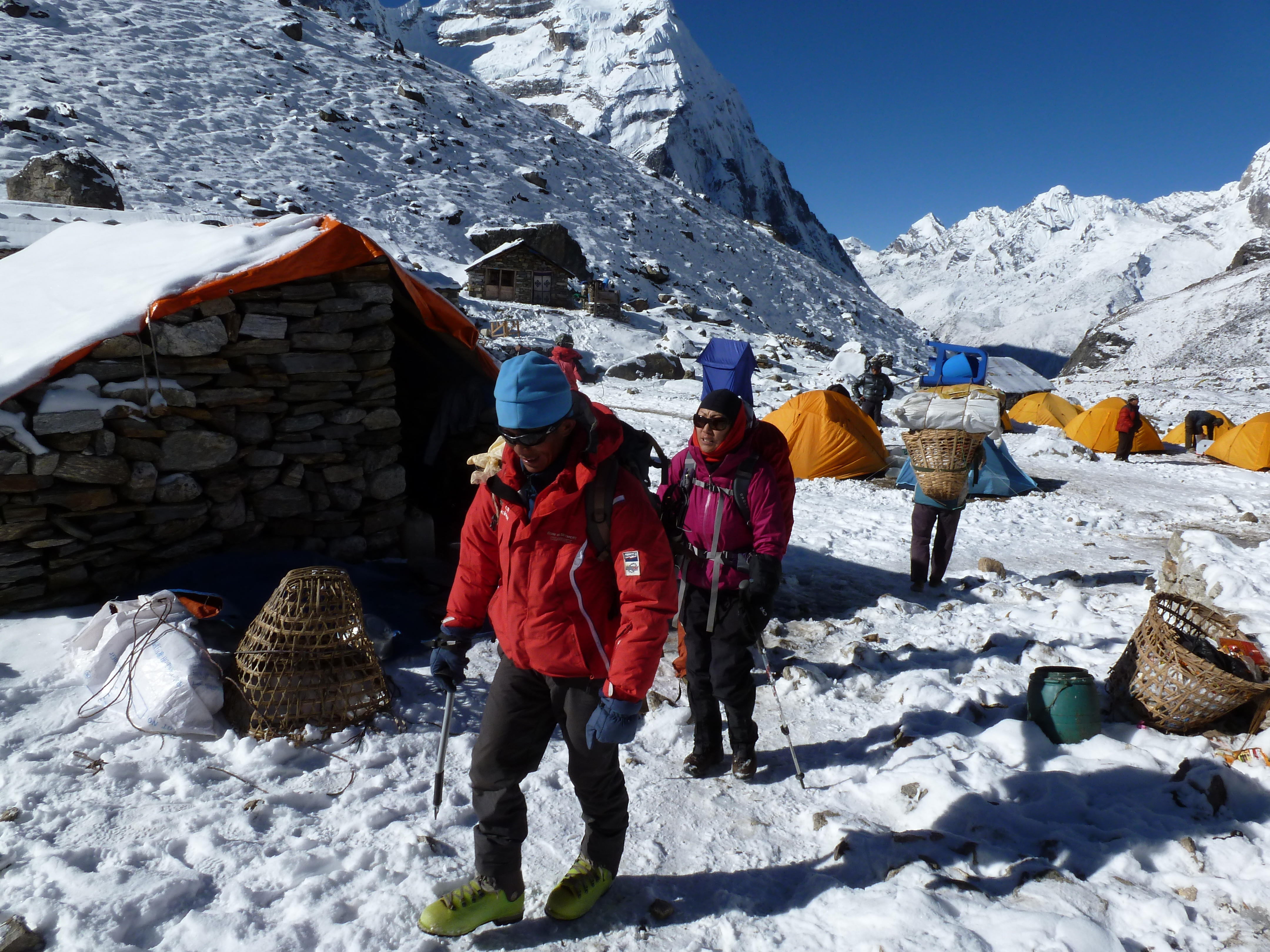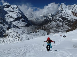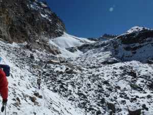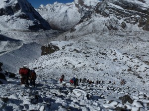 We were awakened at 6am with the announcement that the skies were clear and we would see if we could reach High Camp. After breakfast and bag packing/water bottle thawing, we set out on the same route that turned us back just the day before. This time, with Khare full of frustrated climbers who had waited out yesterday’s storm and also those who had descended to get out of the storm.