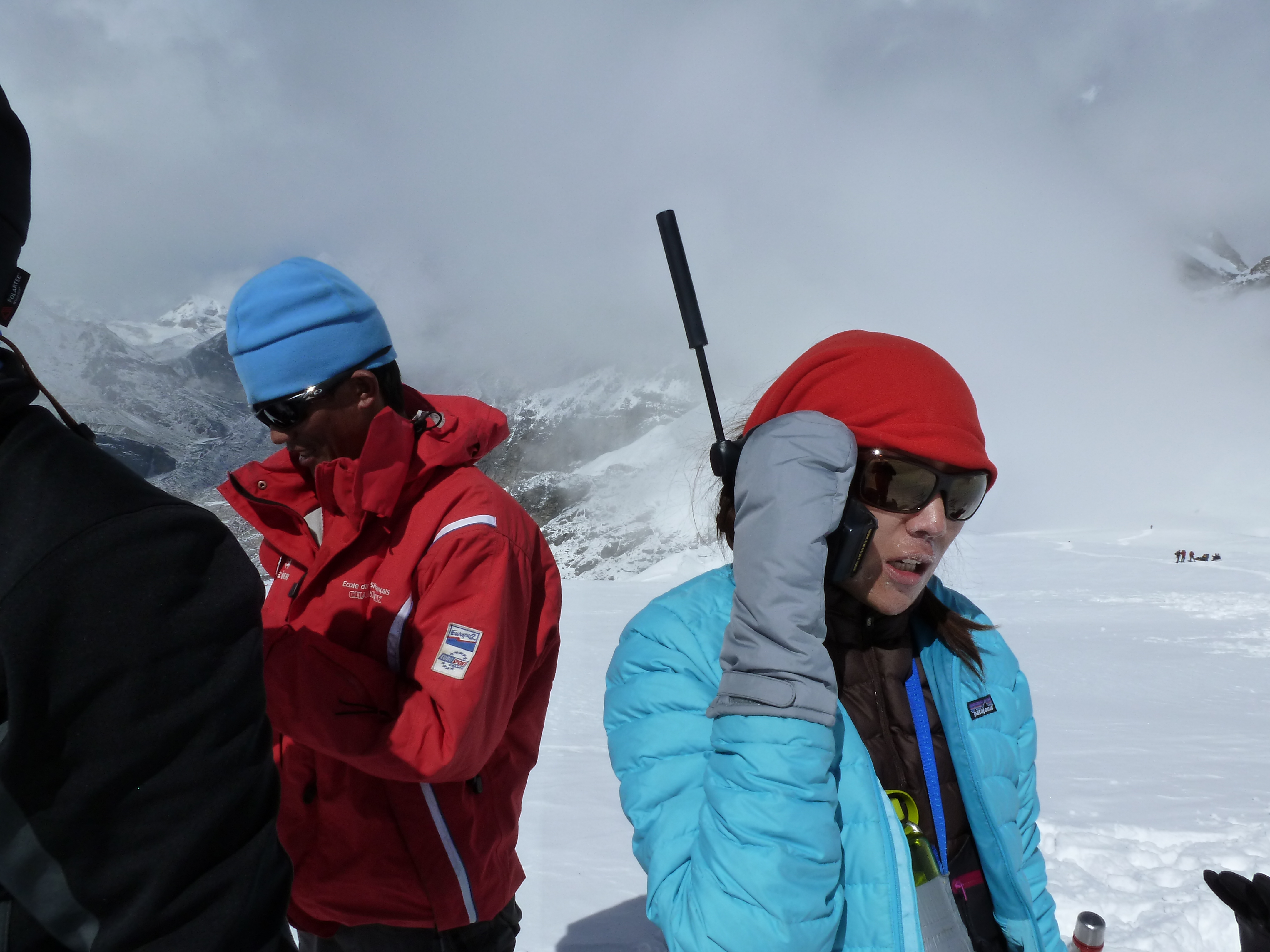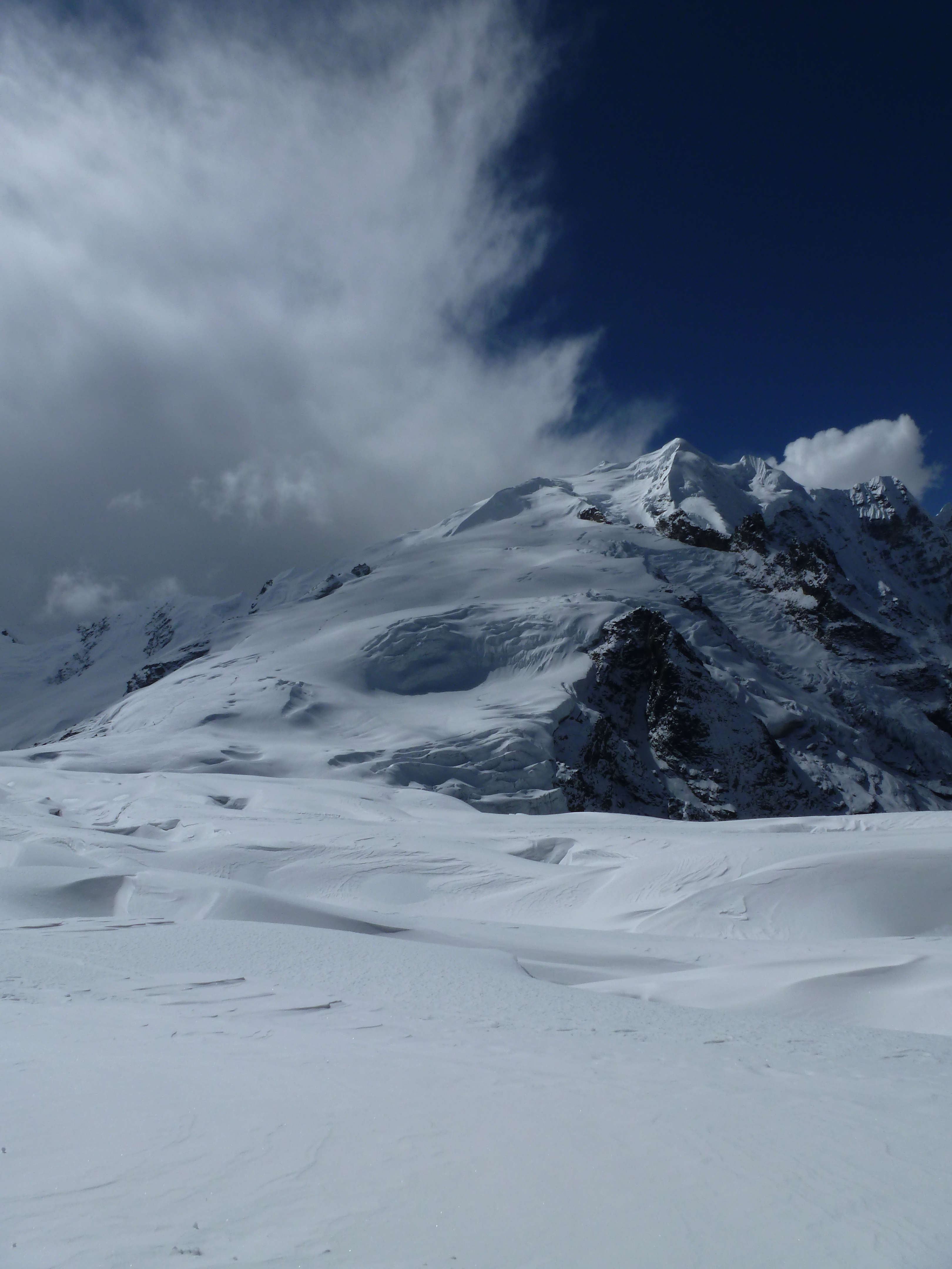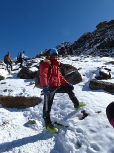 At one point, we passed a few porters and came upon a British climber lying on his side in the snow. He didn’t seem to be in pain, but was not moving and had several others around him. We asked if we could help and was told to, “Find Ian and tell him Gordy broke his leg.” Not knowing Ian and being on a steep section above 5,000 m., this was no easy request. we started out as quickly as I we could, asking every Westerner, “Are you Ian?”