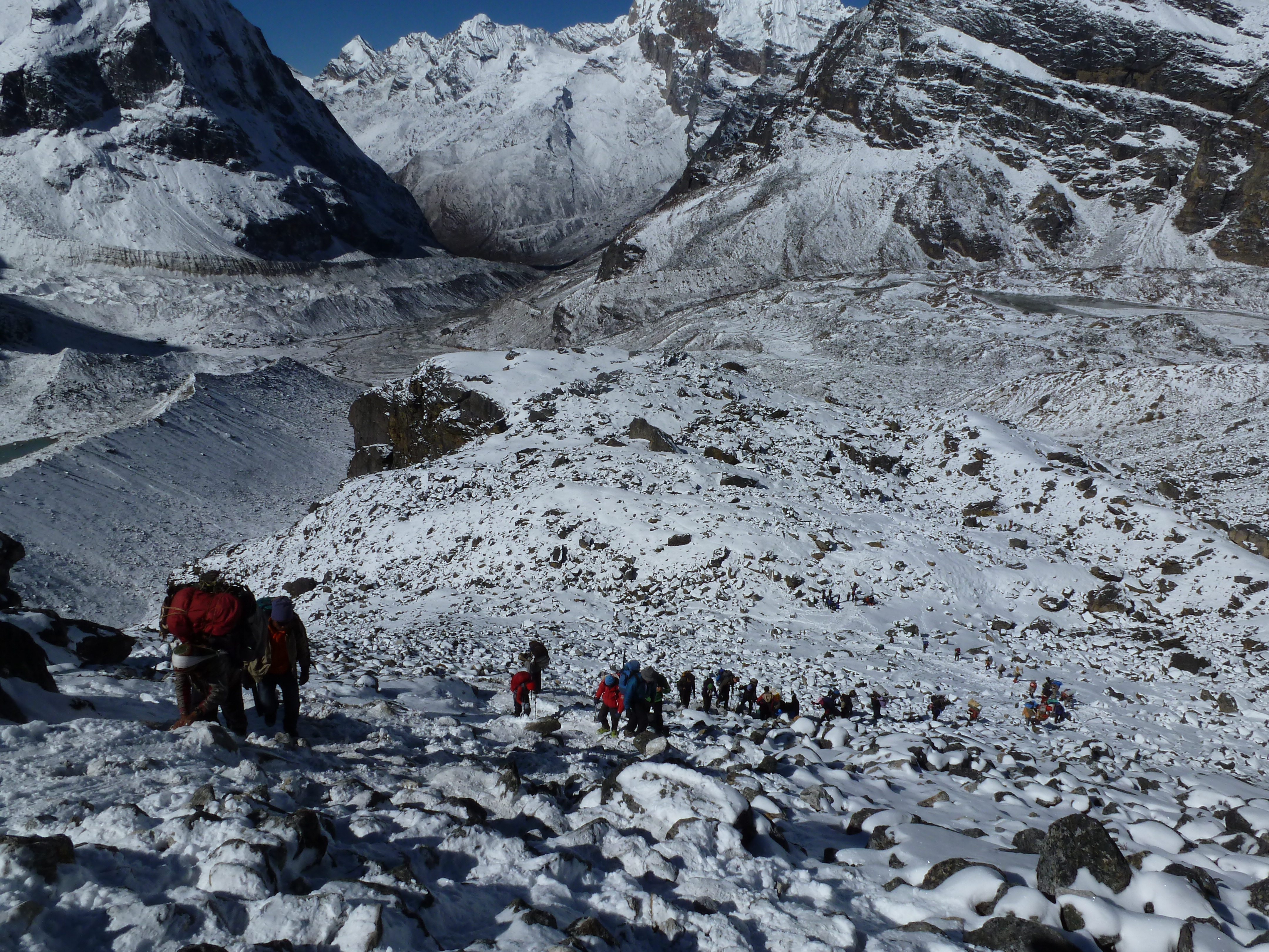 The path down was much more slippery from the many feet that packed the snow as trekkers, guides and porters made their way up. The many Nike and Converse shoes that were worn on the way up polished the snow on and around the rocks in a way that hiking boots and crampons never would, and we felt very fortunate to make it to Khare without any significant falls.