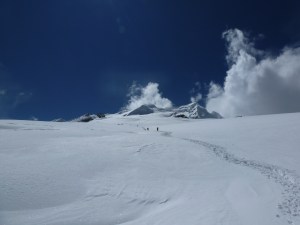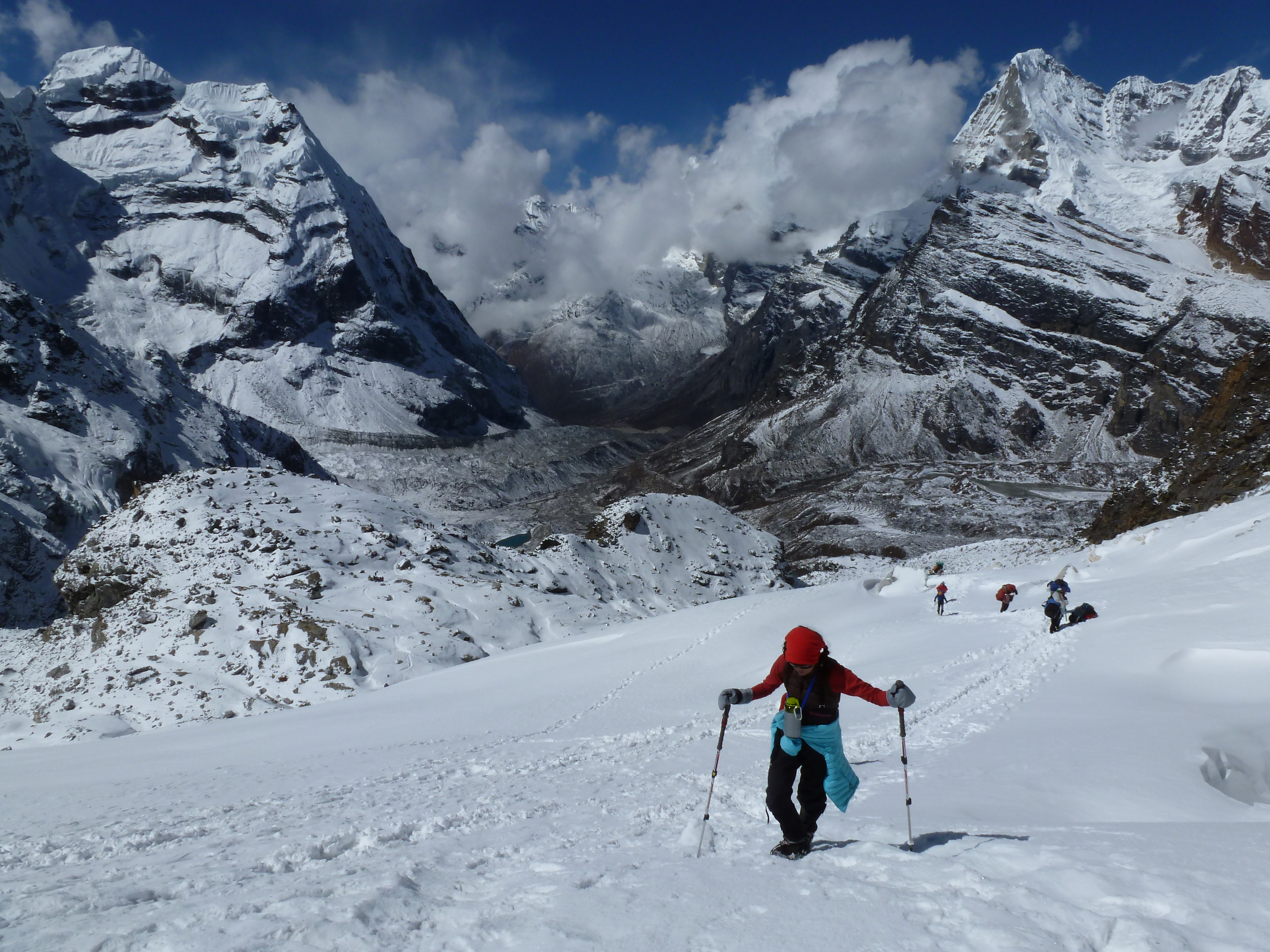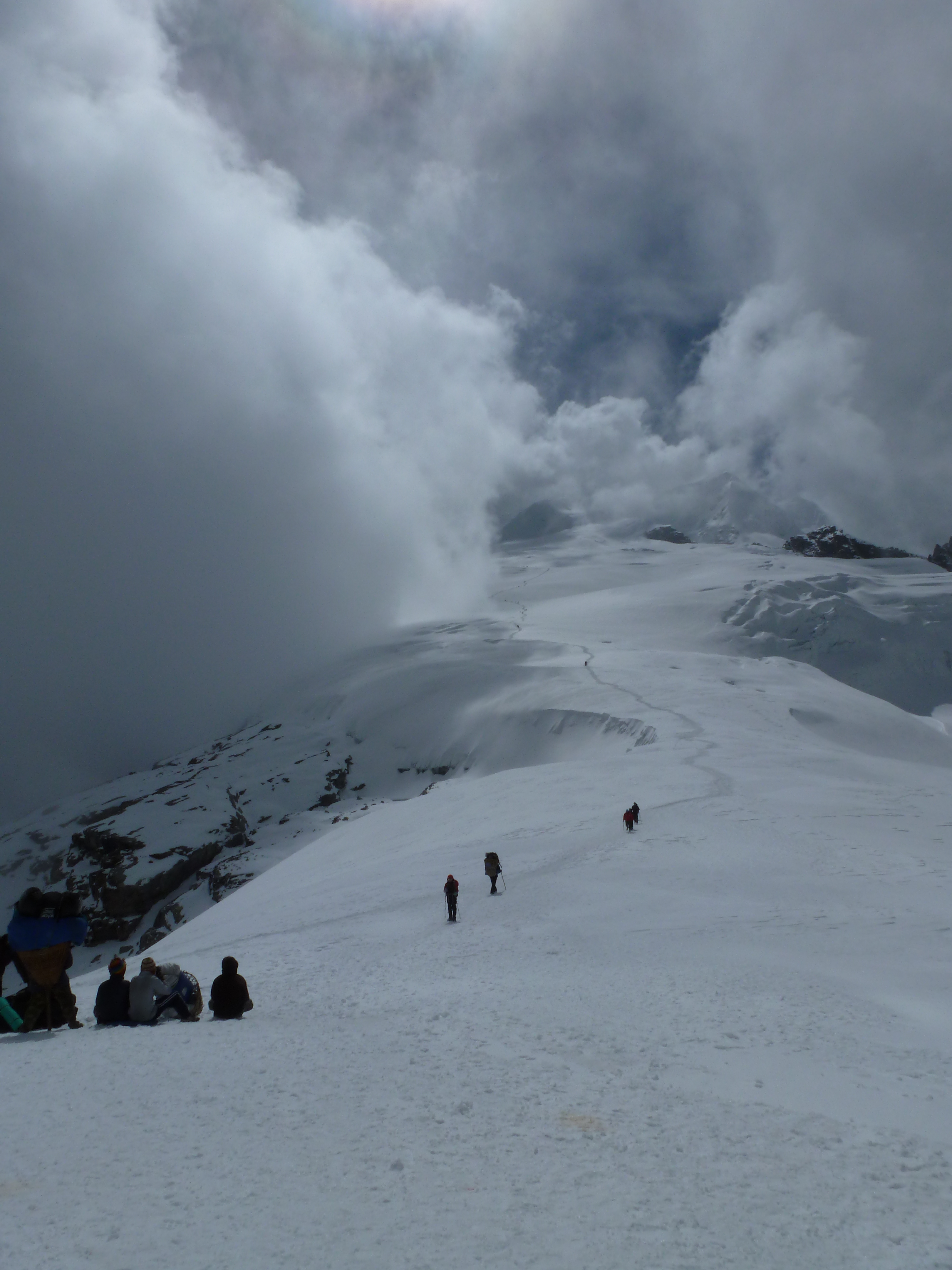 We continued upward, passing the point where we turned around the day before at 5300 m (17,390 ft). This time, however, we could clearly see the layout of the mountain and where the path forward led. Groups that set out much earlier were already small dots in a line far in the distance, making their way to High Camp. The day was still very sunny but there were clouds making their way up from the far side of the mountain and also from the valley back in the direction of Khare.