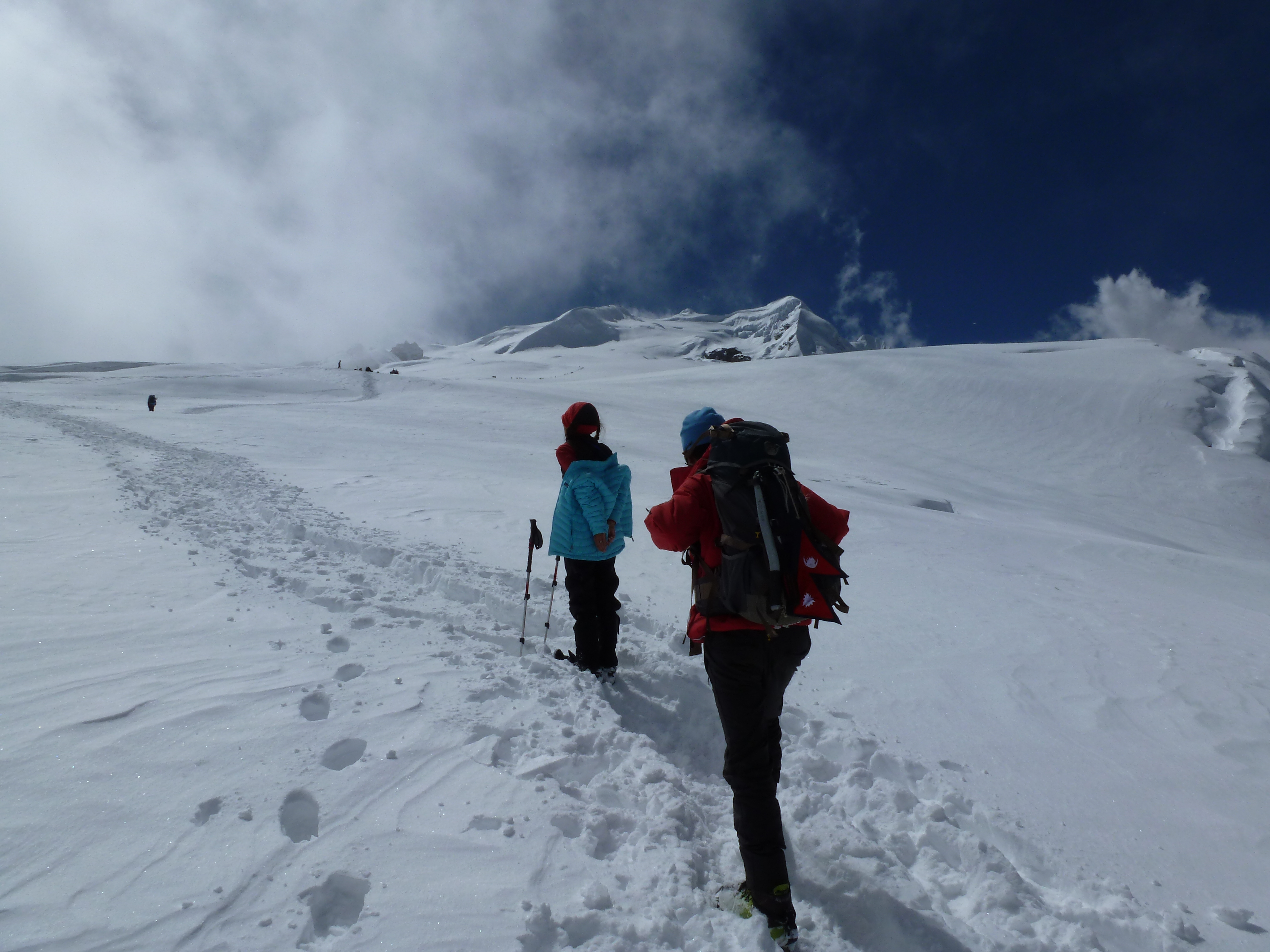 It was still outstanding to reach this height and to be so close to High Camp, which we could make out clearly in the distance. We met some climbers returning who reported that High Camp snow, even after a windy night, was still hip-deep (to a Westerner) and that those setting out from High Camp to the Summit had to turn around due to the exhaustion of breaking a new path in even deeper snow. We made the right call.