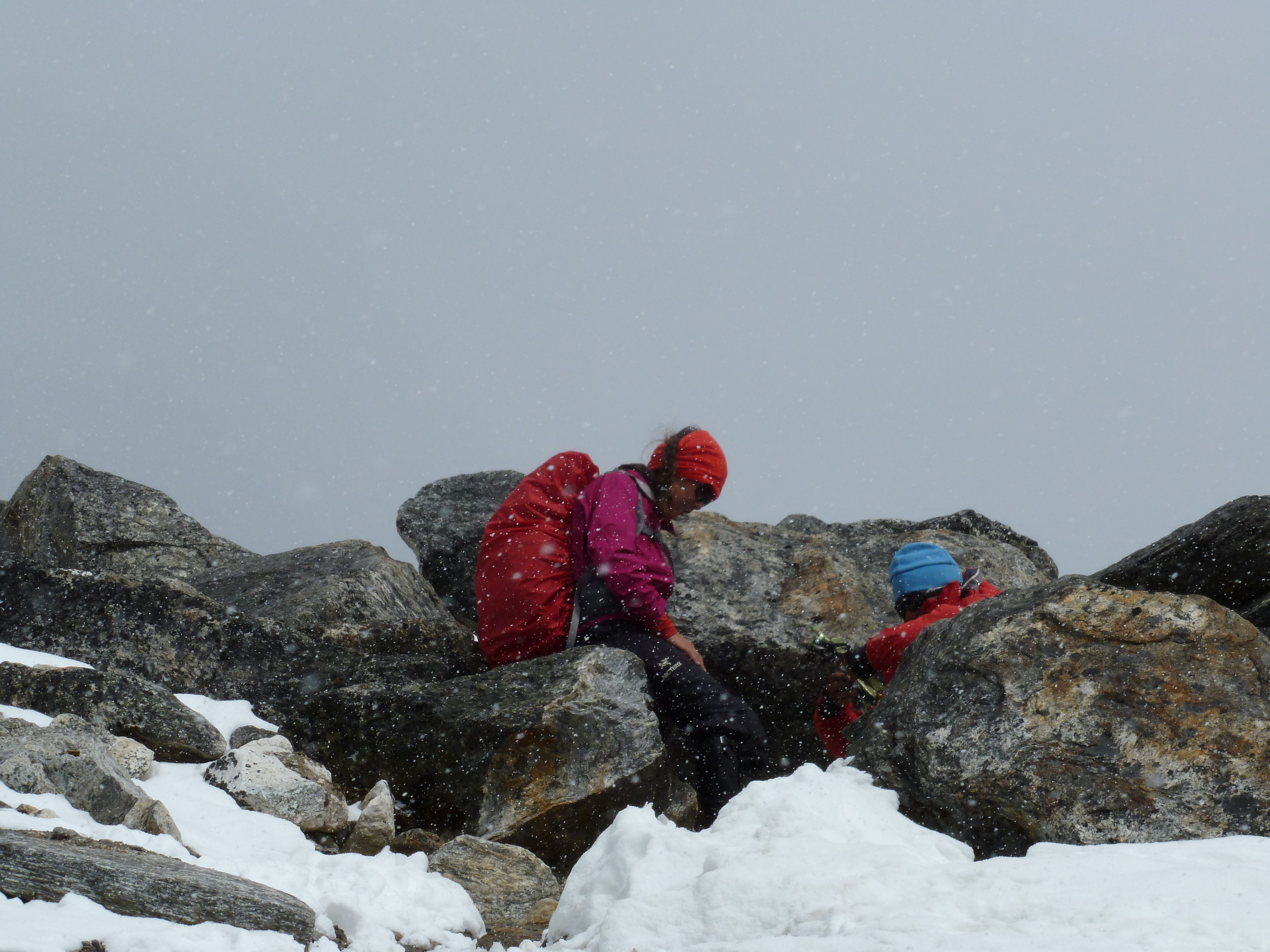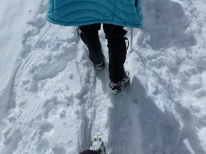 There was less fresh snow than the day before and porters seemed better prepared. Sure, there were still tennis shoes, but some cleverly wrapped with rope to create a “tire chain” effect and others with stretch rubber devices that had small teeth to grip the snow. Our guides, DB and Buddi, both were well-prepared with warm clothing, ice axes and plastic thermal boots. This was likely a necessity for their role in the Expedition but also possibly a reflection of their ‘full time guide’ status within Adventure Geo Treks.