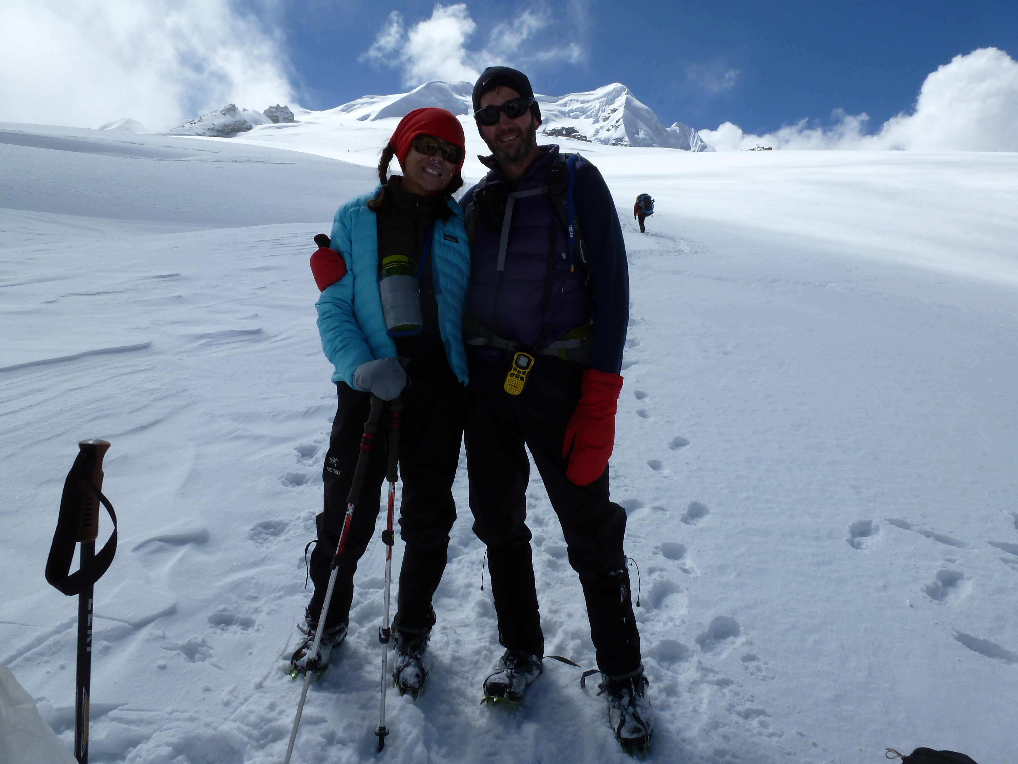 We passed Base Camp just below Mera La at 5400 m (17,716 ft) and continued climbing. It was our personal goal to reach 5500 m (18,000 ft) so that we could have a nice round number as our personal best altitude. Along the way, we picked up Ursi and Dennis and encouraged them higher and to join in our goal, which they gladly did.
