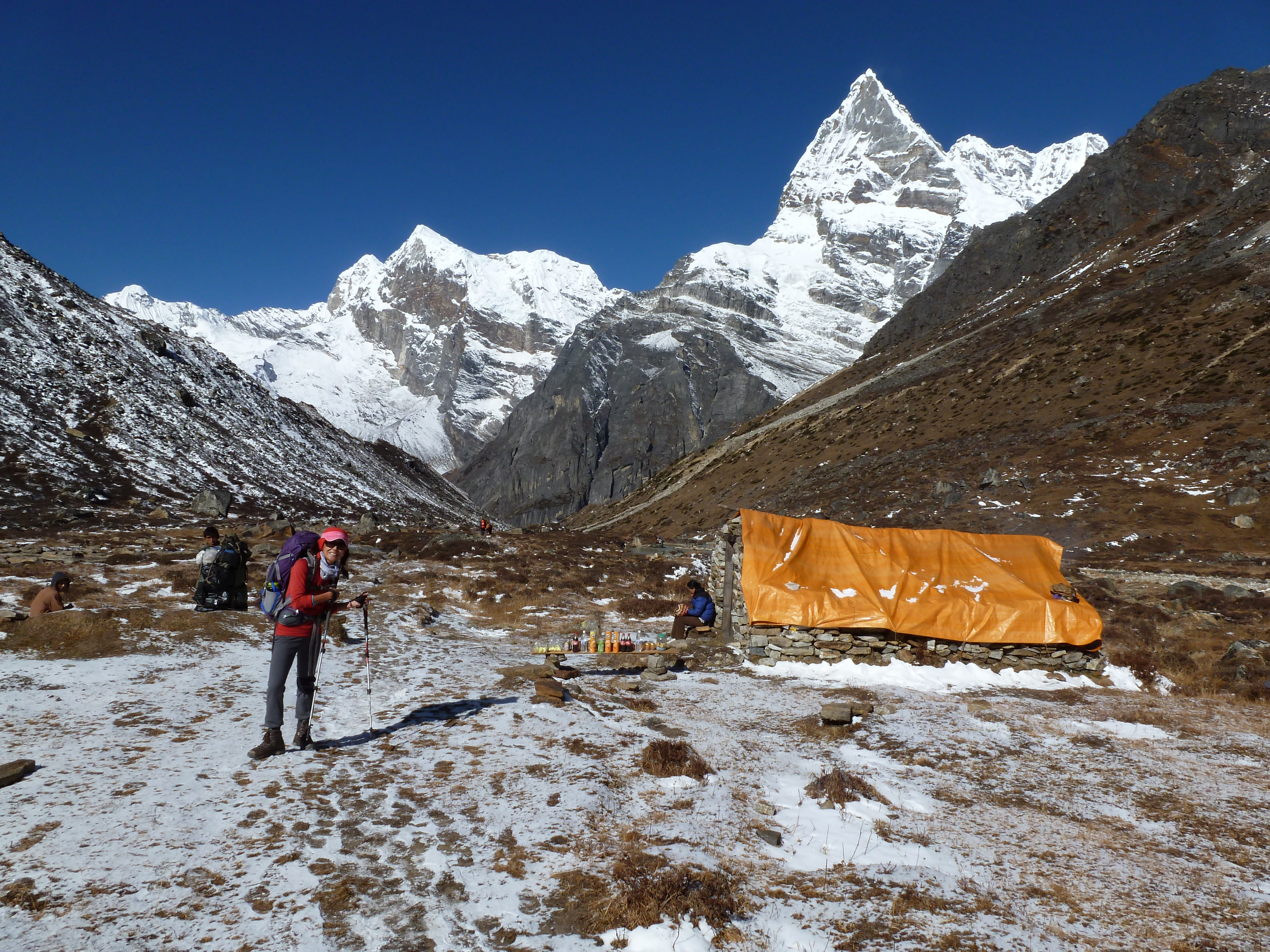 It wasn’t a great night of sleep. We finally figured out a system for keeping warm in our sleeping bags, but it was a night of tossing and turning as we exhausted ourselves on the climb and developed sinus infections. Daylight finally came at 6am and we looked forward to getting lower and warmer. The day began with a two-hour walk down to Tangnag, the last campsite we visited before Khare. We rested in the warm sun and the staff made our lunch.