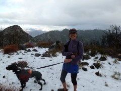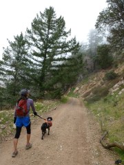 We knew the first part of the trail very well, as we’ve hiked as far as Mount Lowe Trail Camp several times. It is an excellent picnic destination in the Summer. Each time we’ve had a reason not to press on to the Summit, but this time we were determined to make it. We very quickly made our way through the paved section, past the areas left black by the Station Fire, the trees denuded of their bark by the ferocious windstorm two months ago. We passed the Cape of Good Hope, a curious name for the flat saddle just before the pavement ends. We continued past Circle Bridge, the turnoff for Dawn Mine, and the photogenic Granite Gate. We were moving very quickly and the dogs were in fine form.