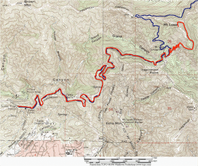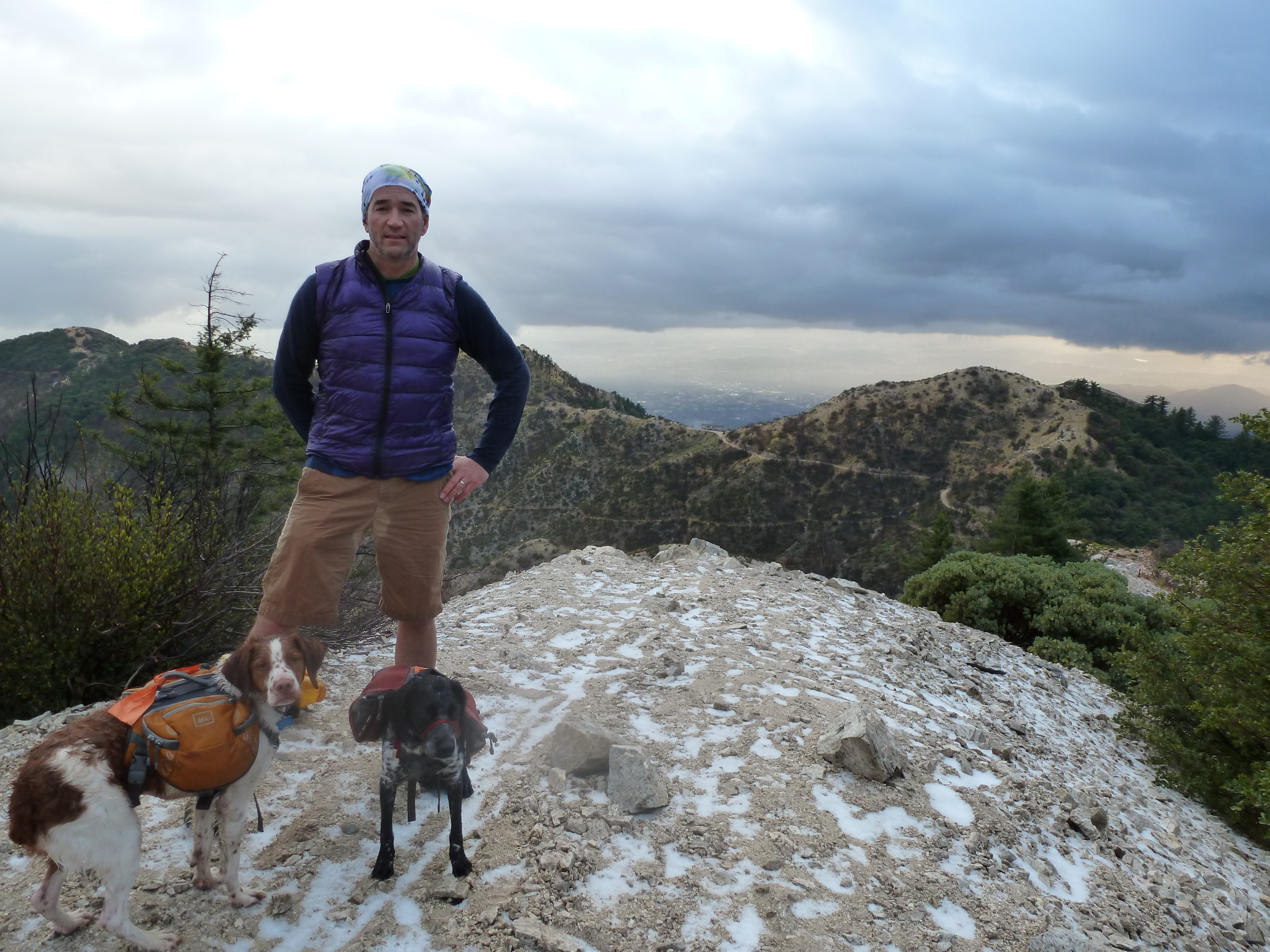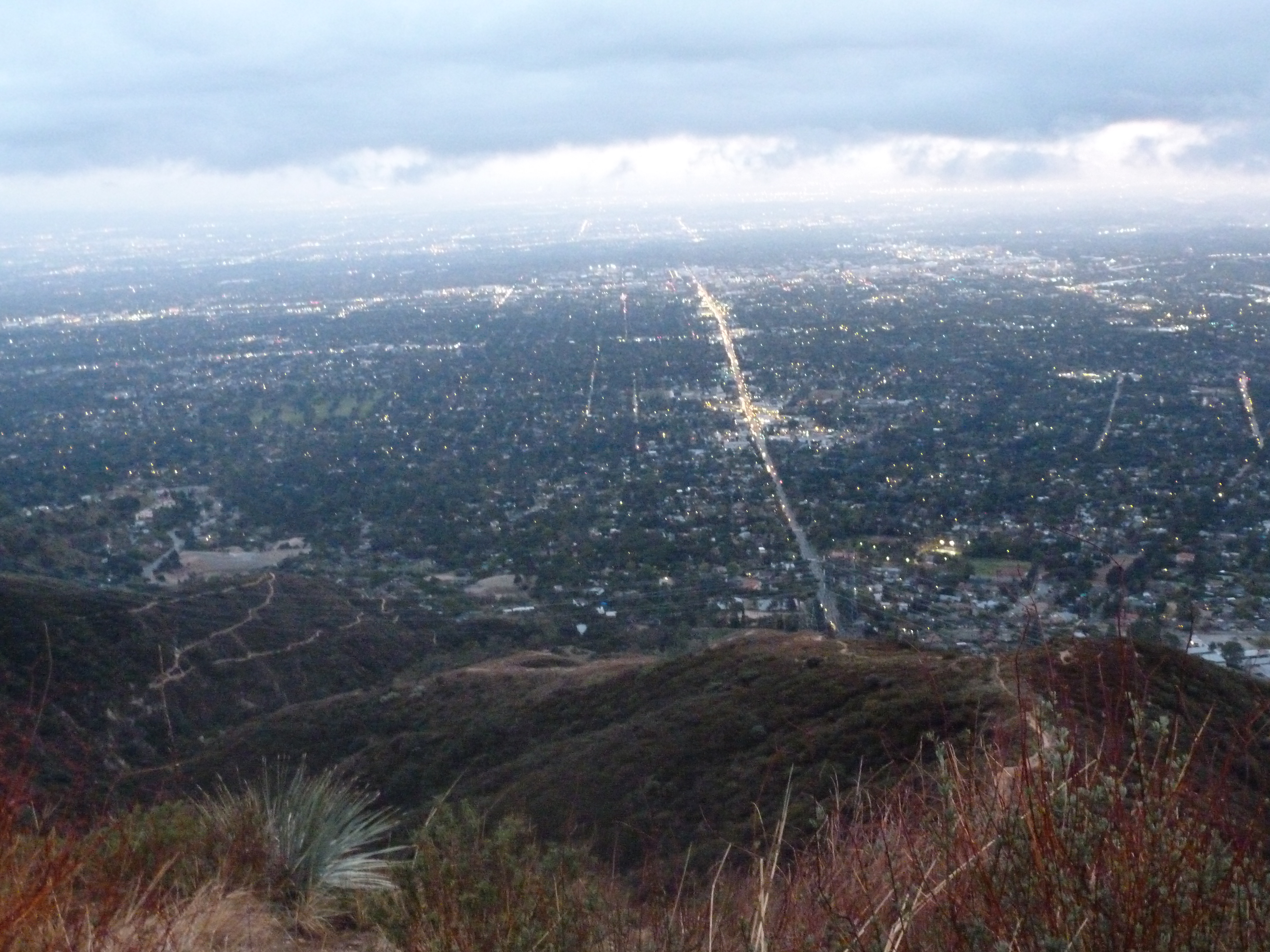 Other than a brief stop to take a photo with Inspiration Point in the background, we walked non-stop and very fast to the car, arriving well after dark (we did remember our headlamps) but with a great view of the lights of Pasadena and Los Angeles along the way. While the air is always warmer as you go lower, it was also dark by that point and much colder than when we started.
