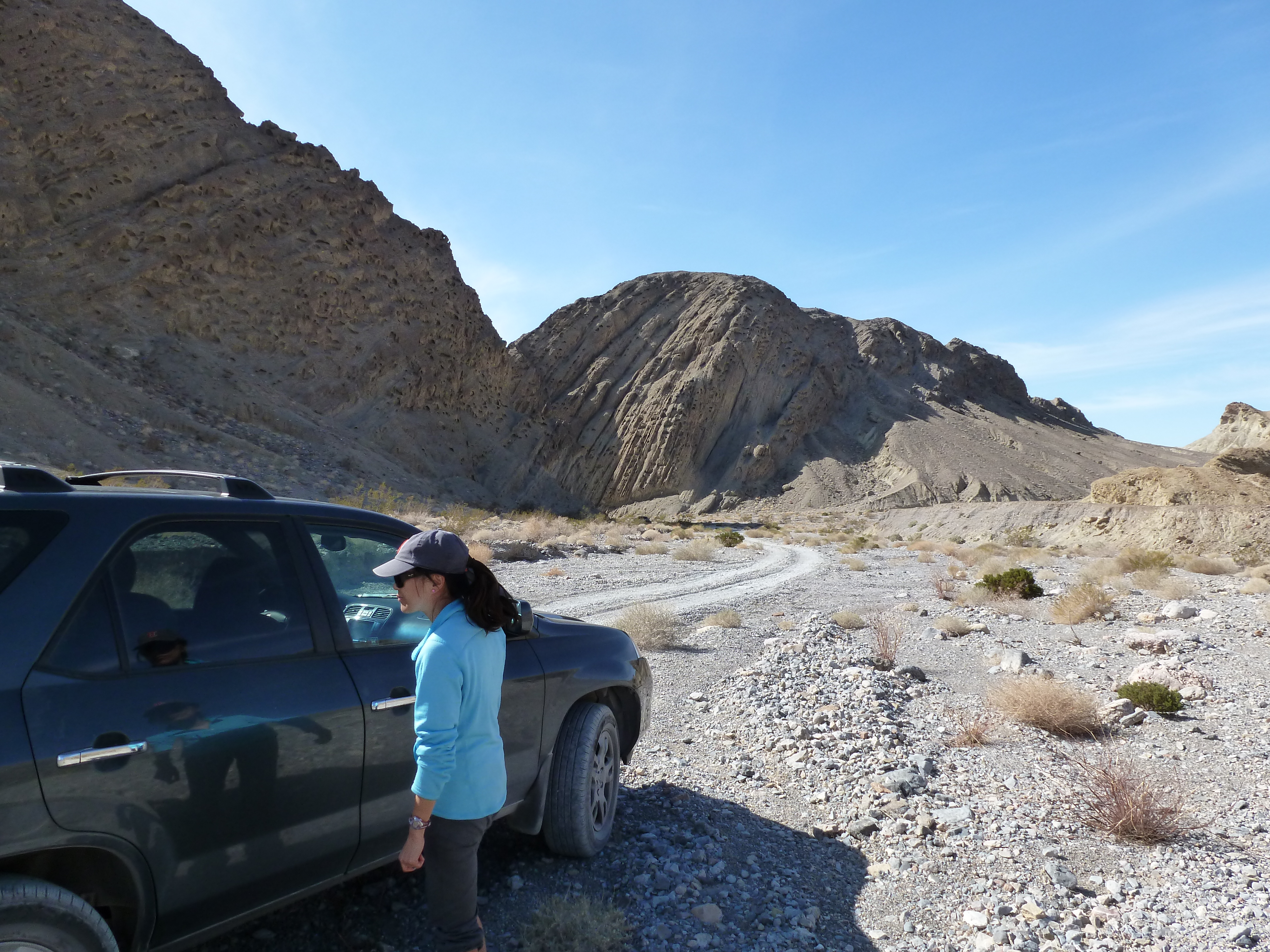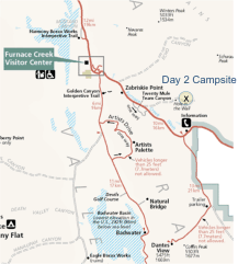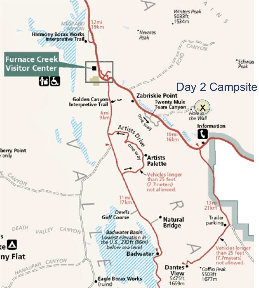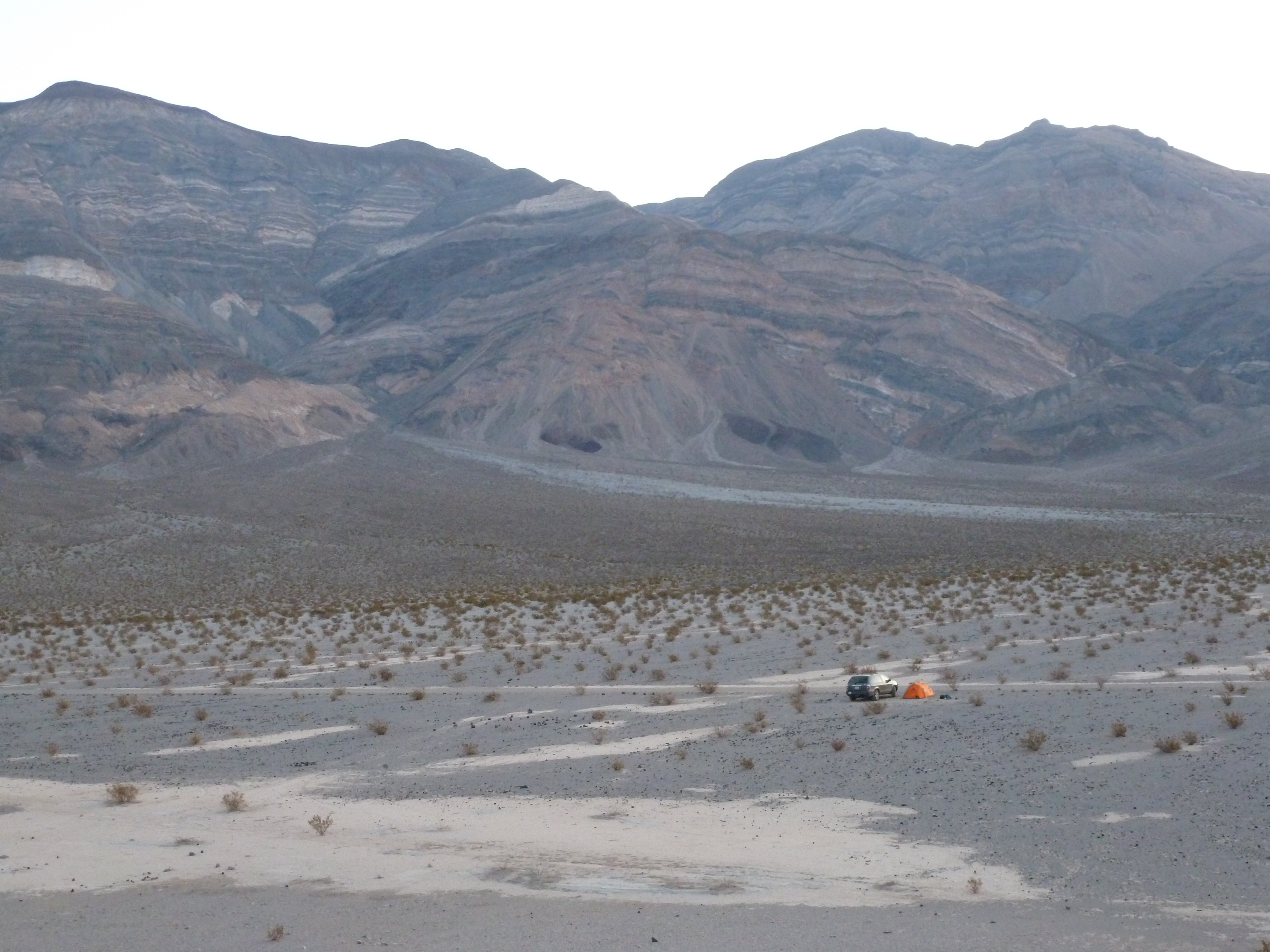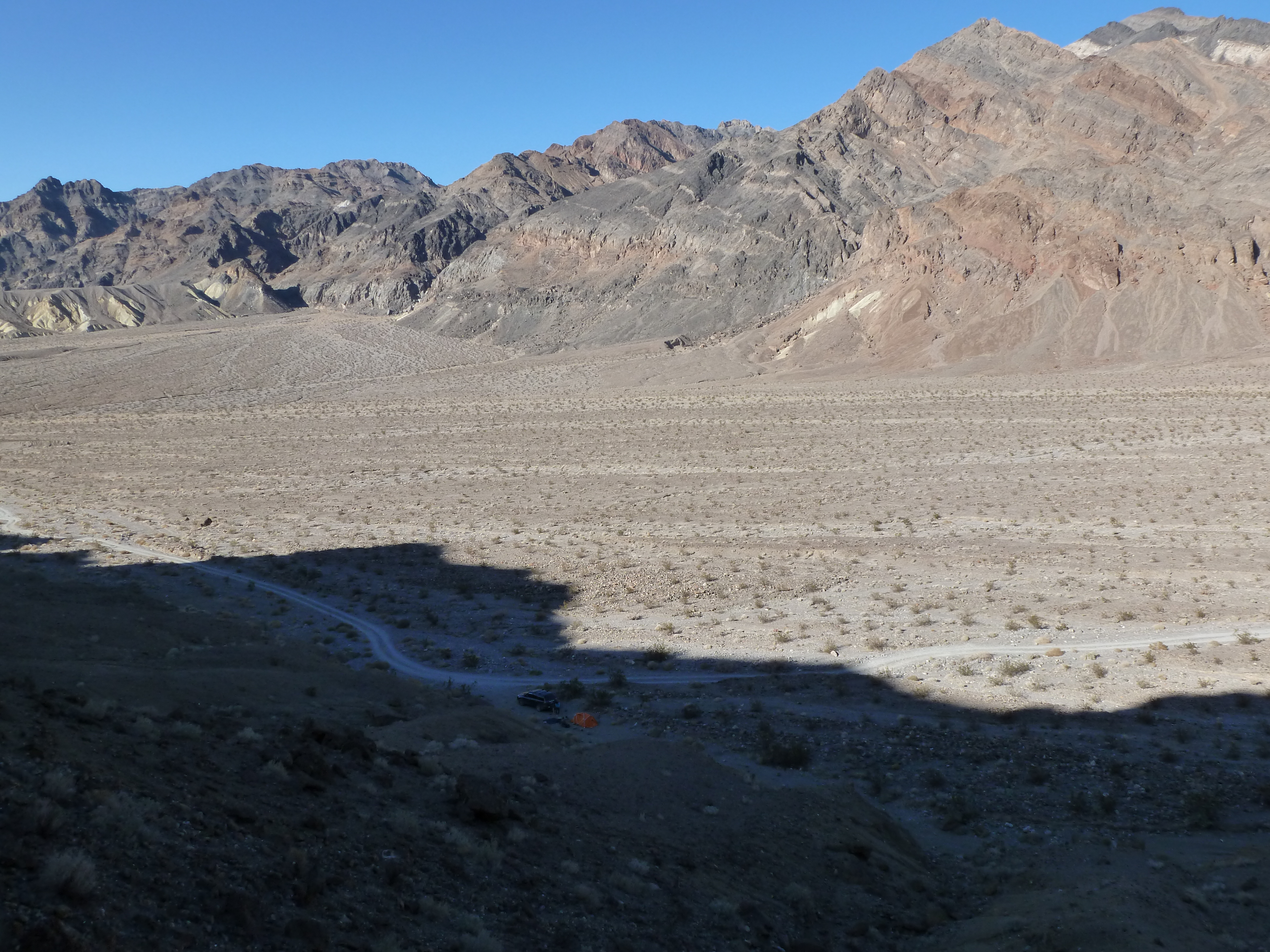 We had our customary coffee before packing our tent and gear and making our way into Death Valley proper. The drive starts with a considerable descent down a long canyon from Panamint Valley. As Death Valley stretches out in full view, the road becomes flat and passes the first campground and cabins come into view.